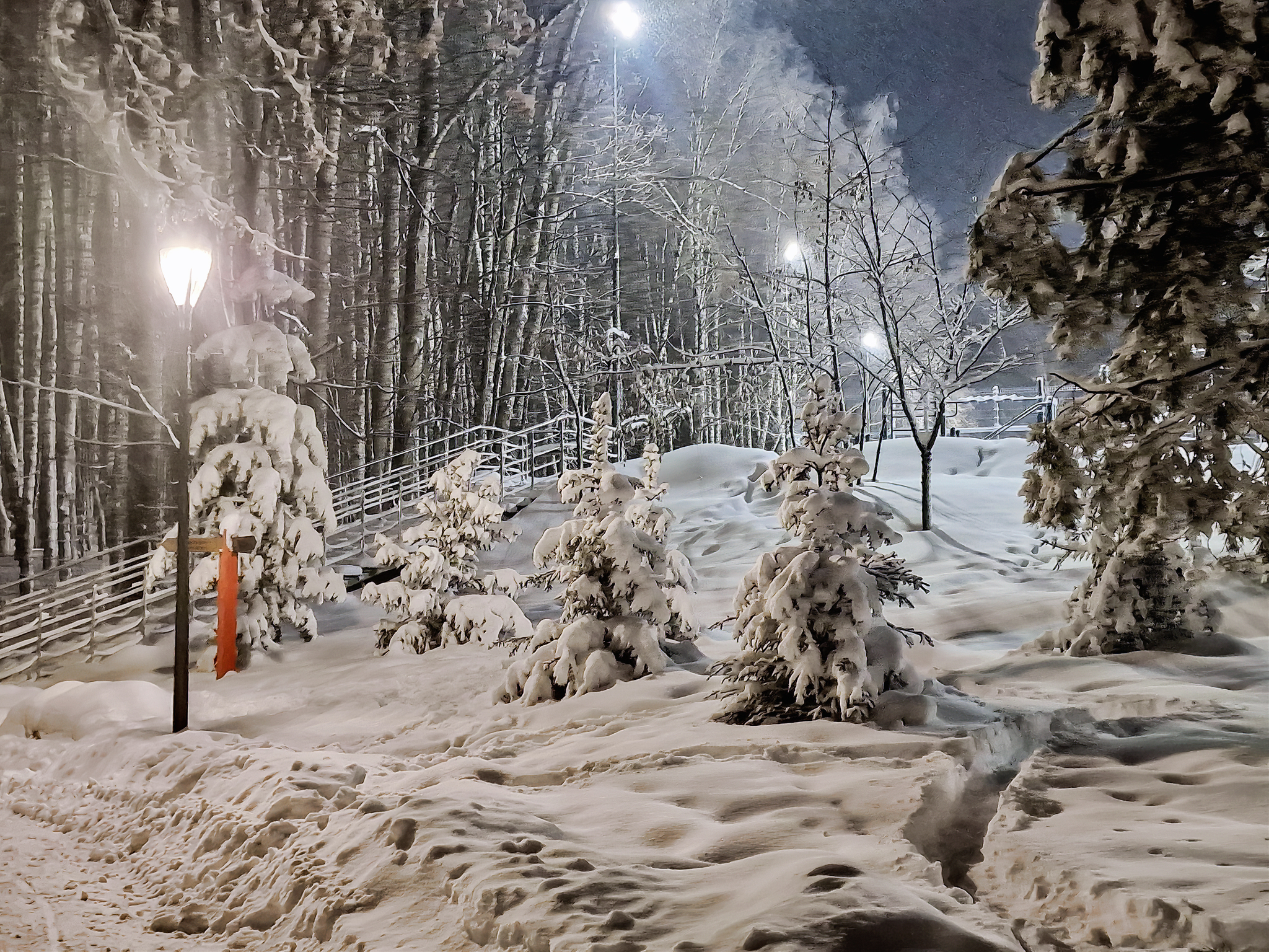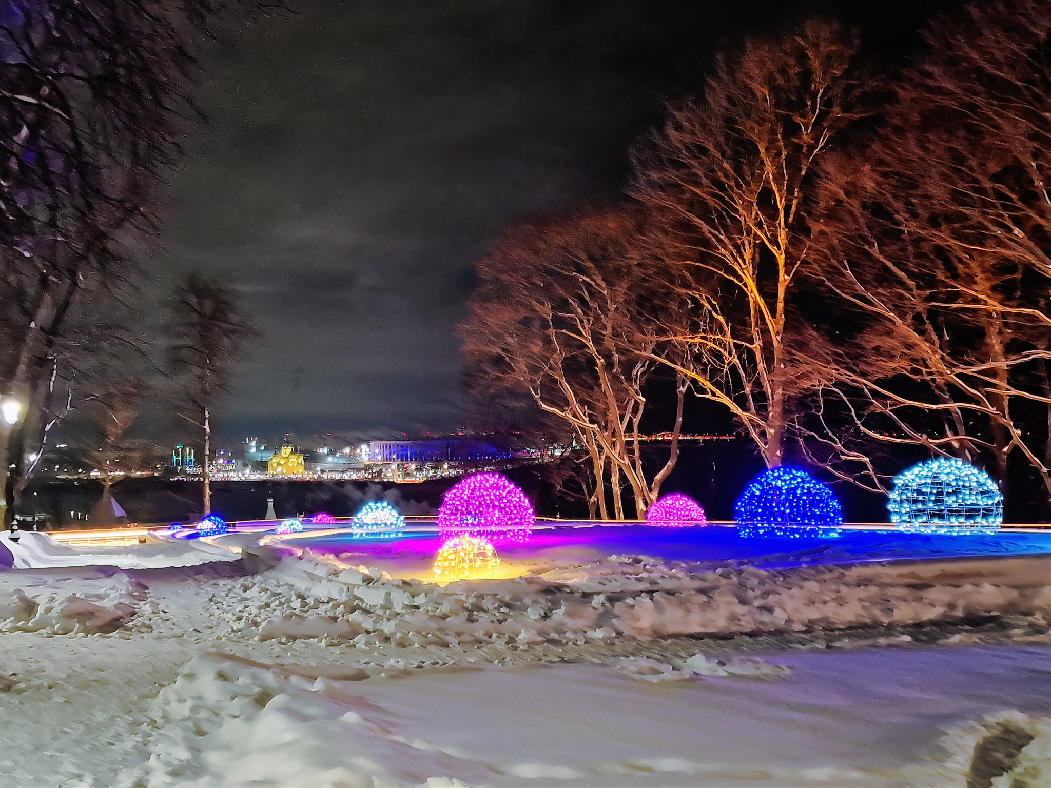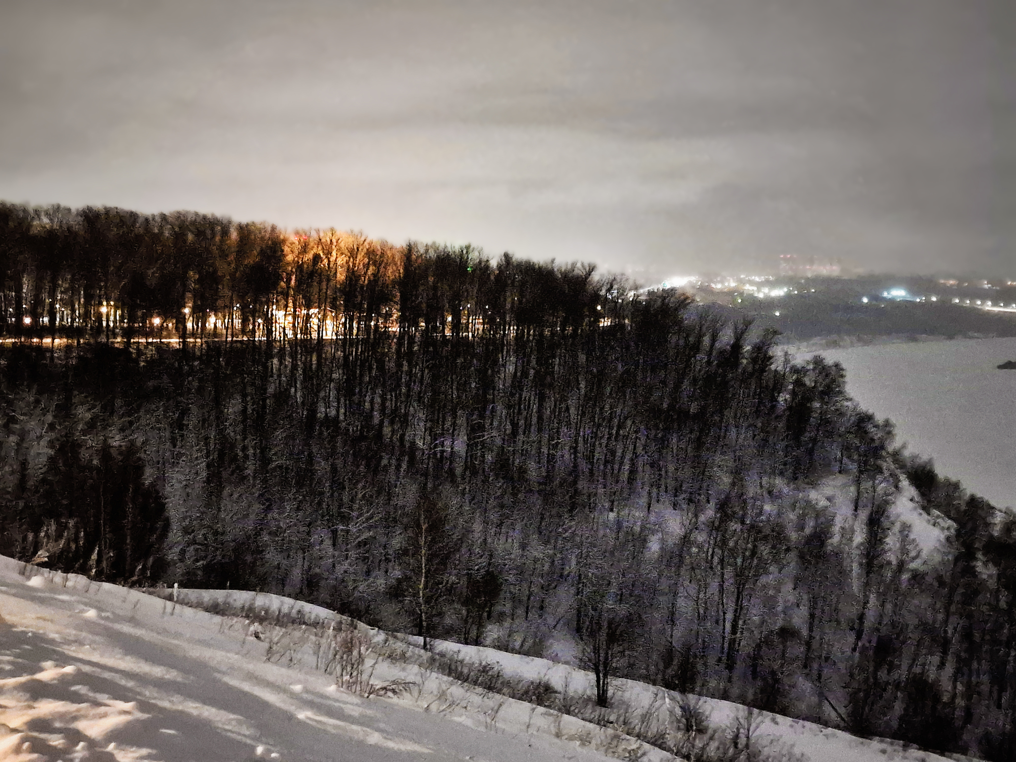 А потом мы просто погулялись по ночному парку по аллейке над откосом. Заснеженные деревья создают "сказочное" настроение. Низкие облака, два дня засыпавшие Нижний снегом, как отражатели подсвечивают панораму заречной части.