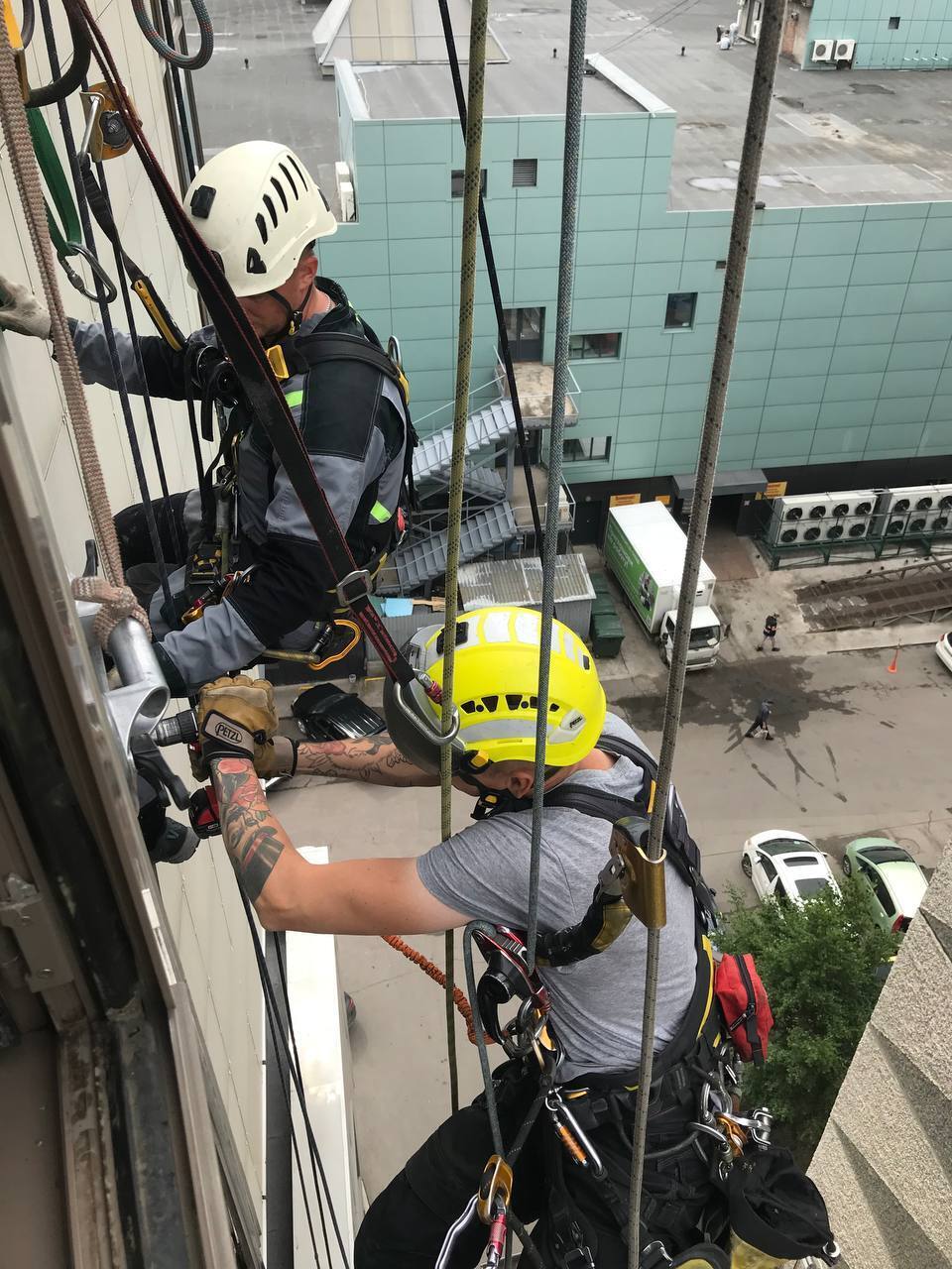 Так много веревок потому, что это последний этаж, и я просто кинул с крыши 2 полтинника, привязав за середины, и получил 4 веревки. Удобно перевешиваться, позиционироваться. Концов много не бывает.
