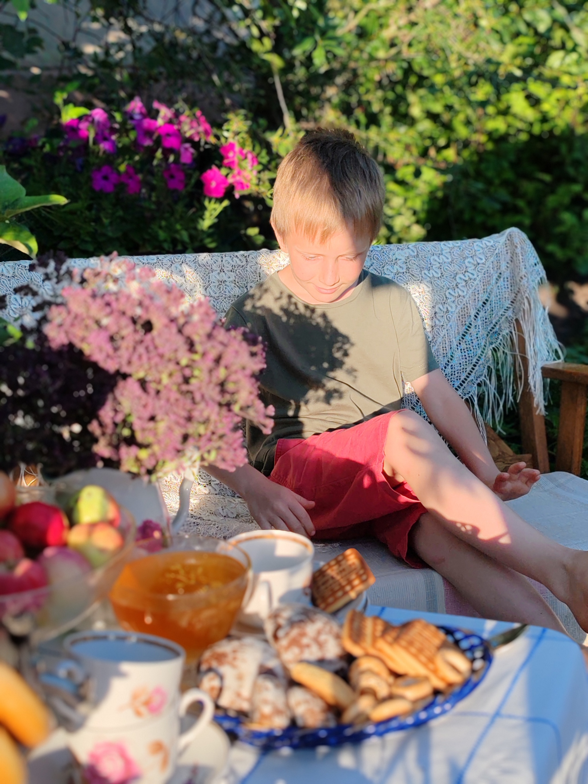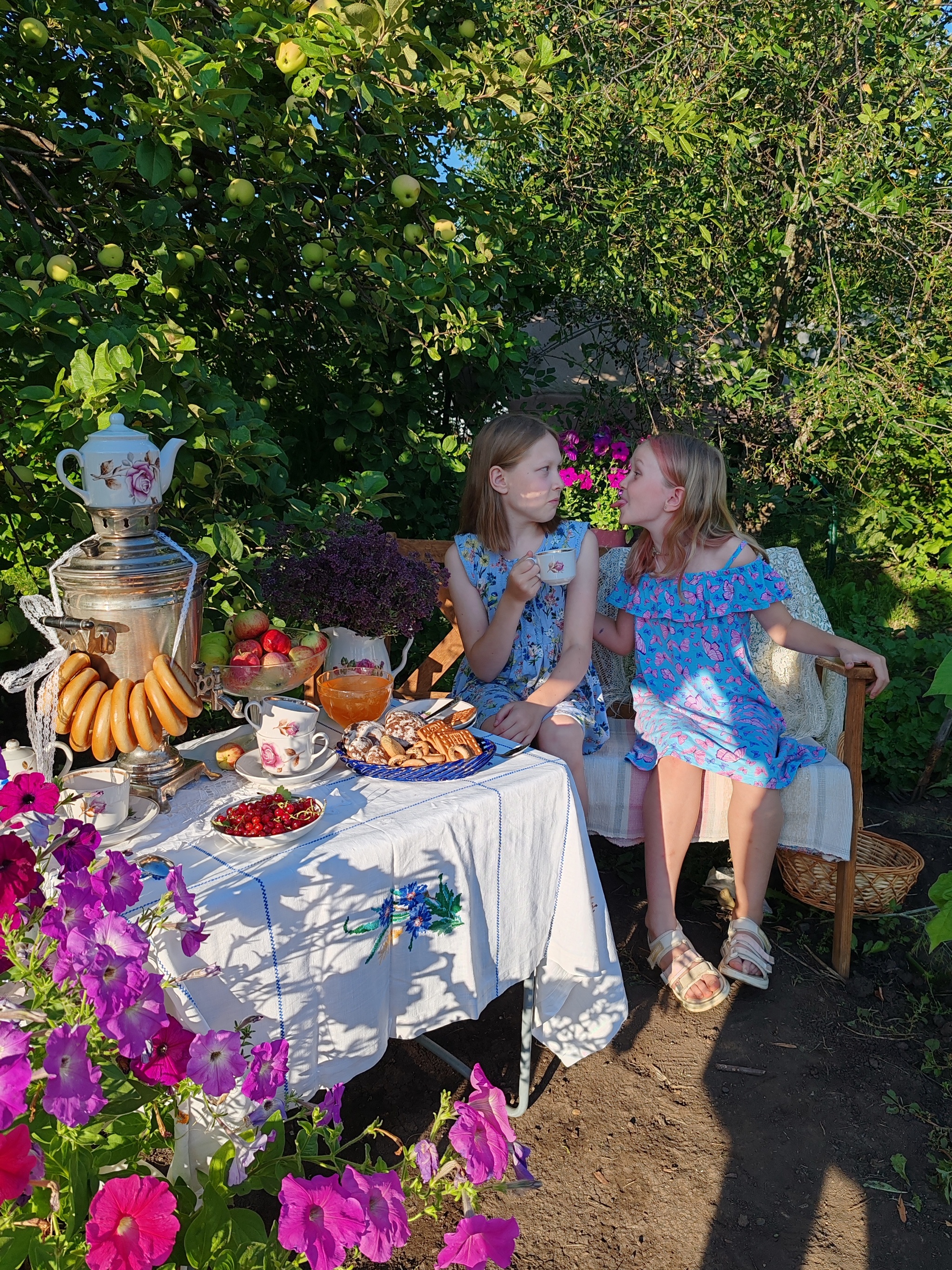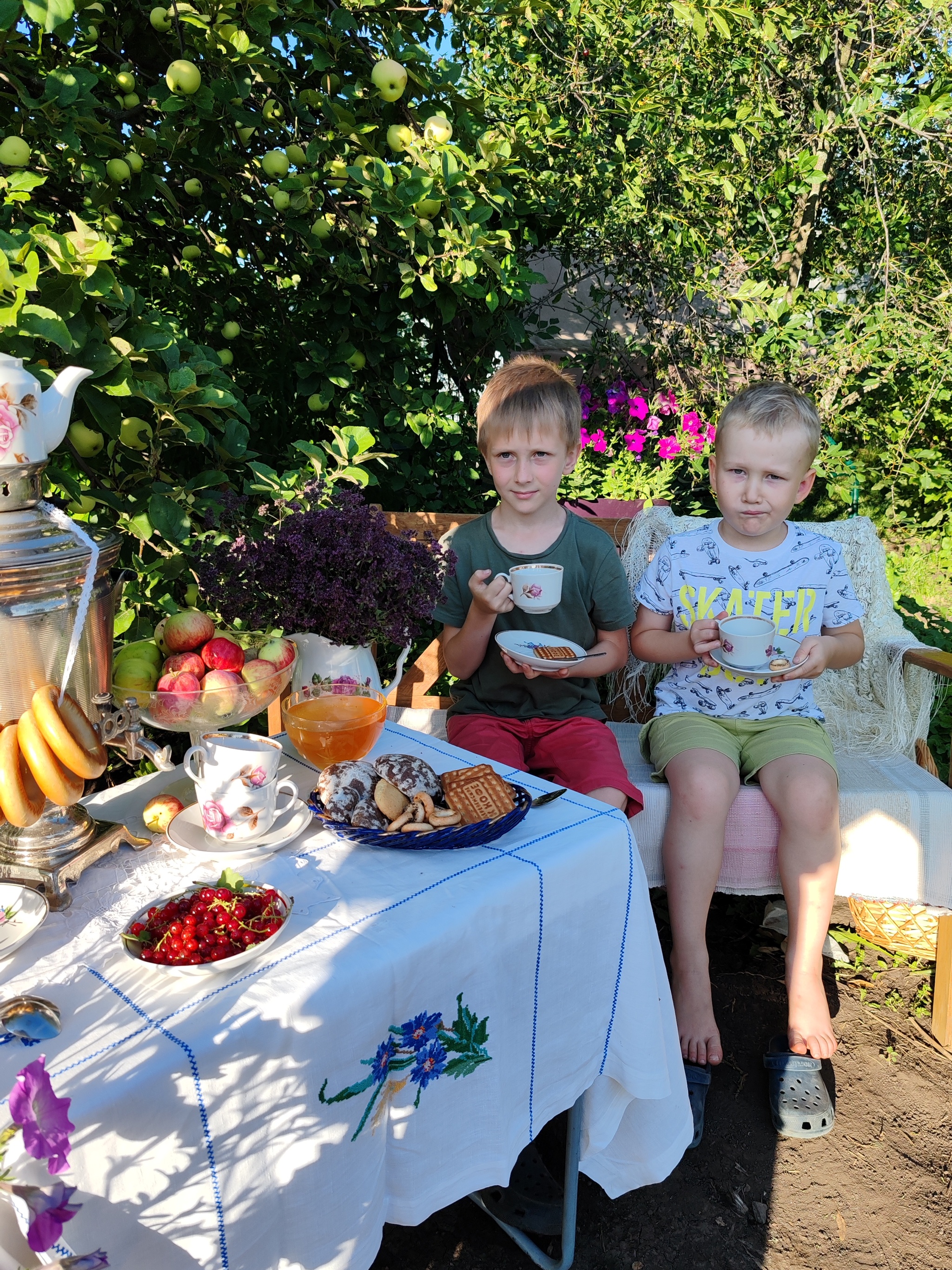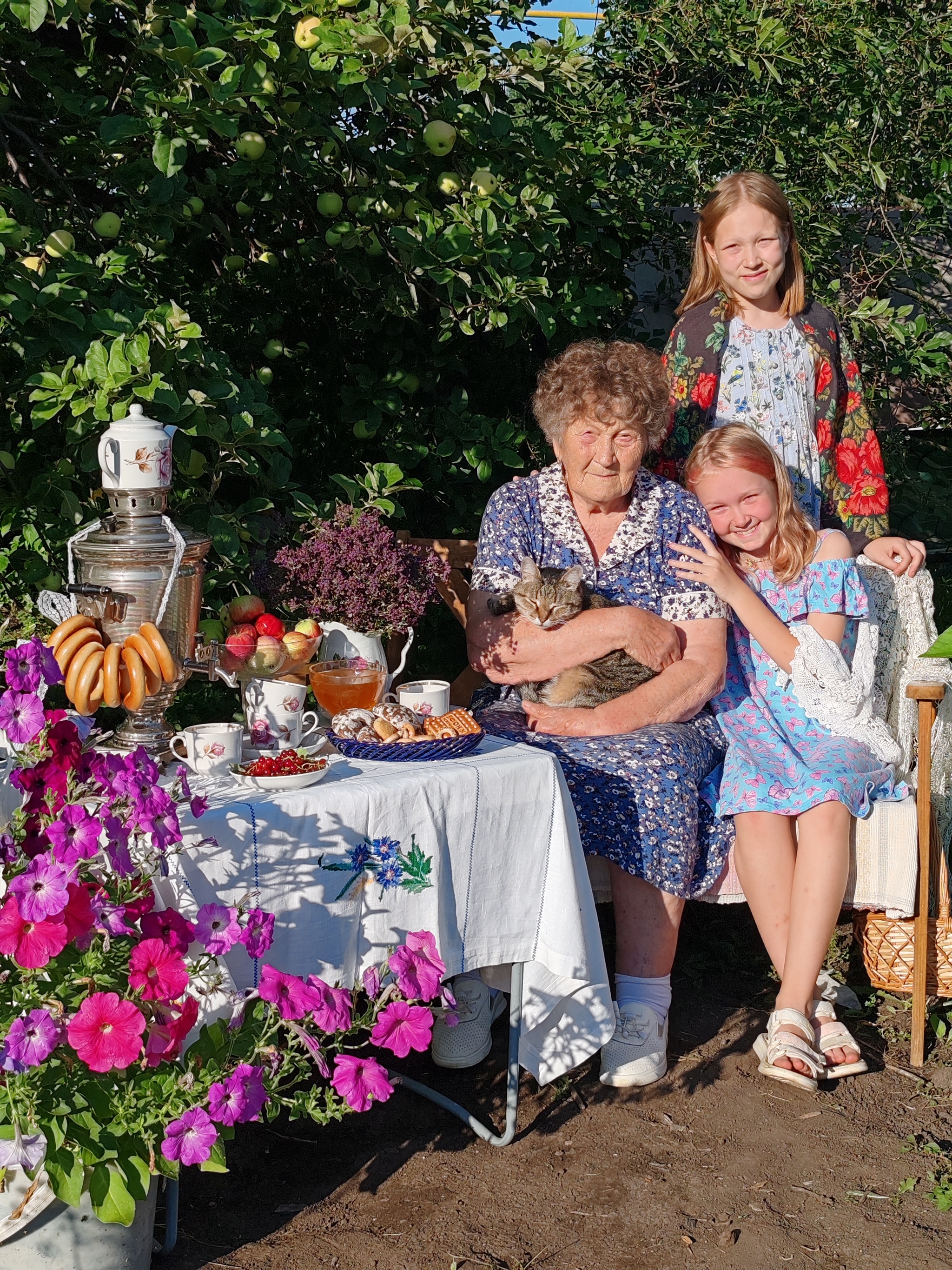 Гостили в этом году двумя семьями, где по 2ое внуков нашей героической бабушки, а всего у неё их 15! У Тамары Ивановны 6 детей и эти руки вырастили их в любви, а теперь не могут остановиться и ухаживают за домом и садом. Было решено создать уютную зону с домашним убранством и нафоткать бабушку как минимум с внучками, а мальчишки были у нас запасным планом, надежды усадить их за стол, где пока ничего нельзя есть, а только улыбаться, было крайне мало)