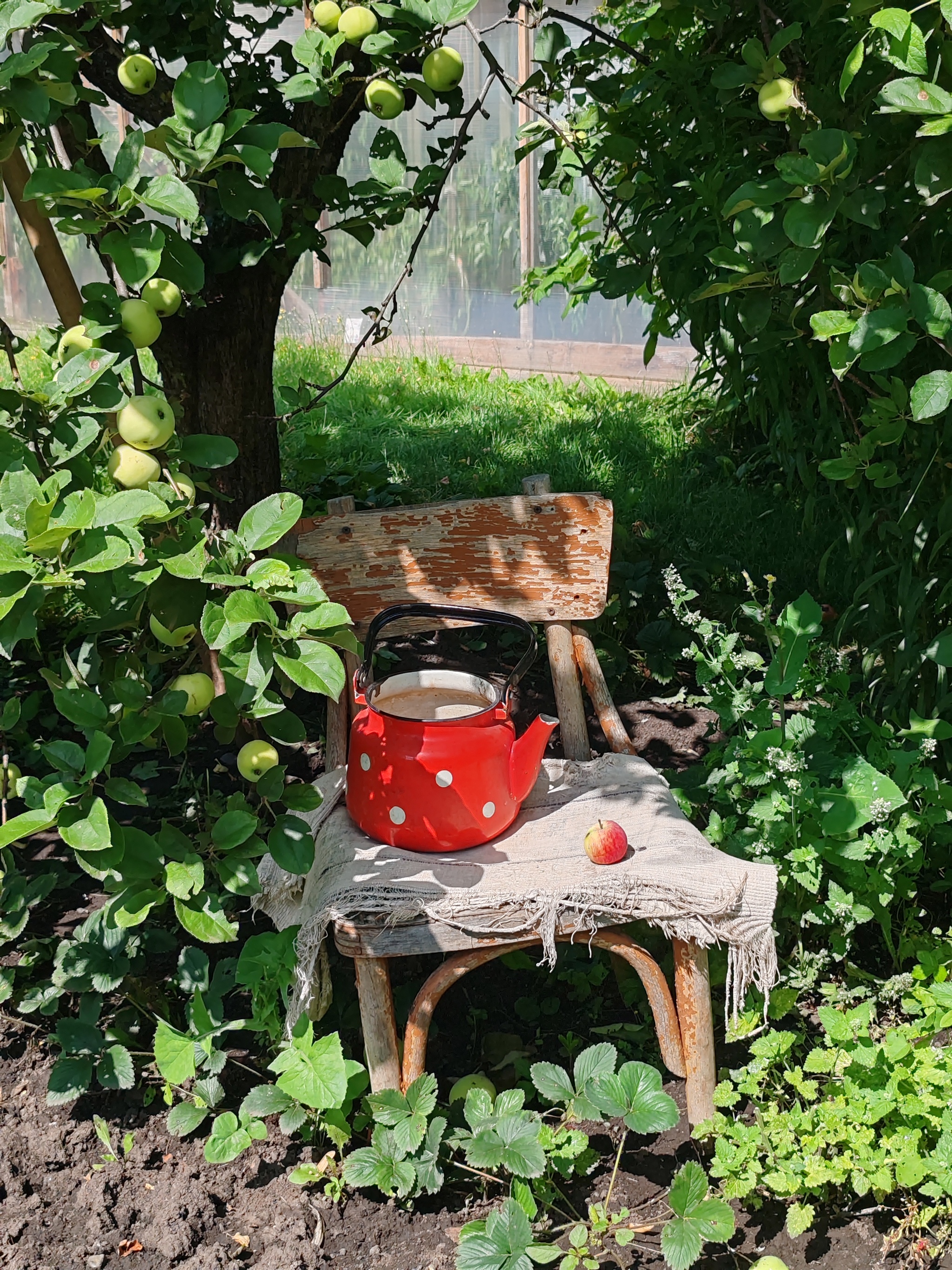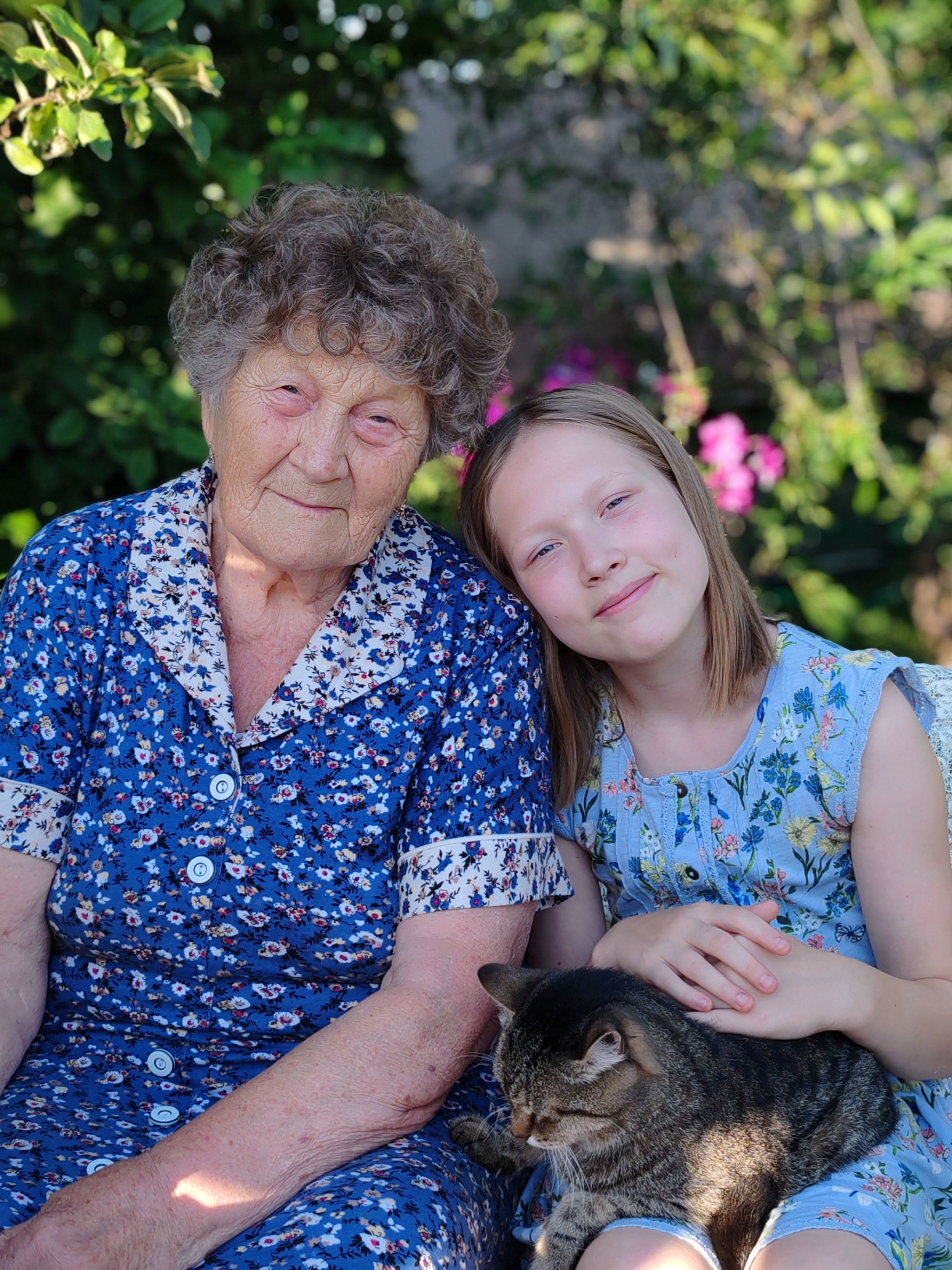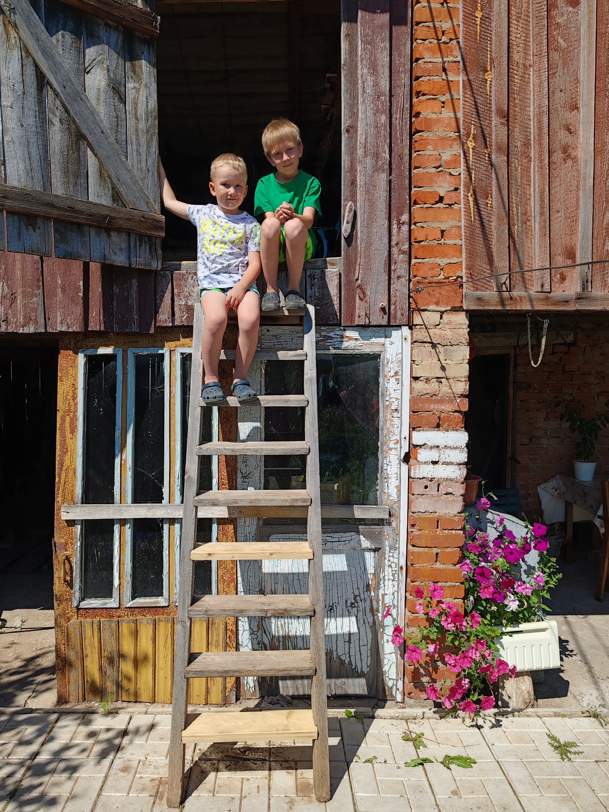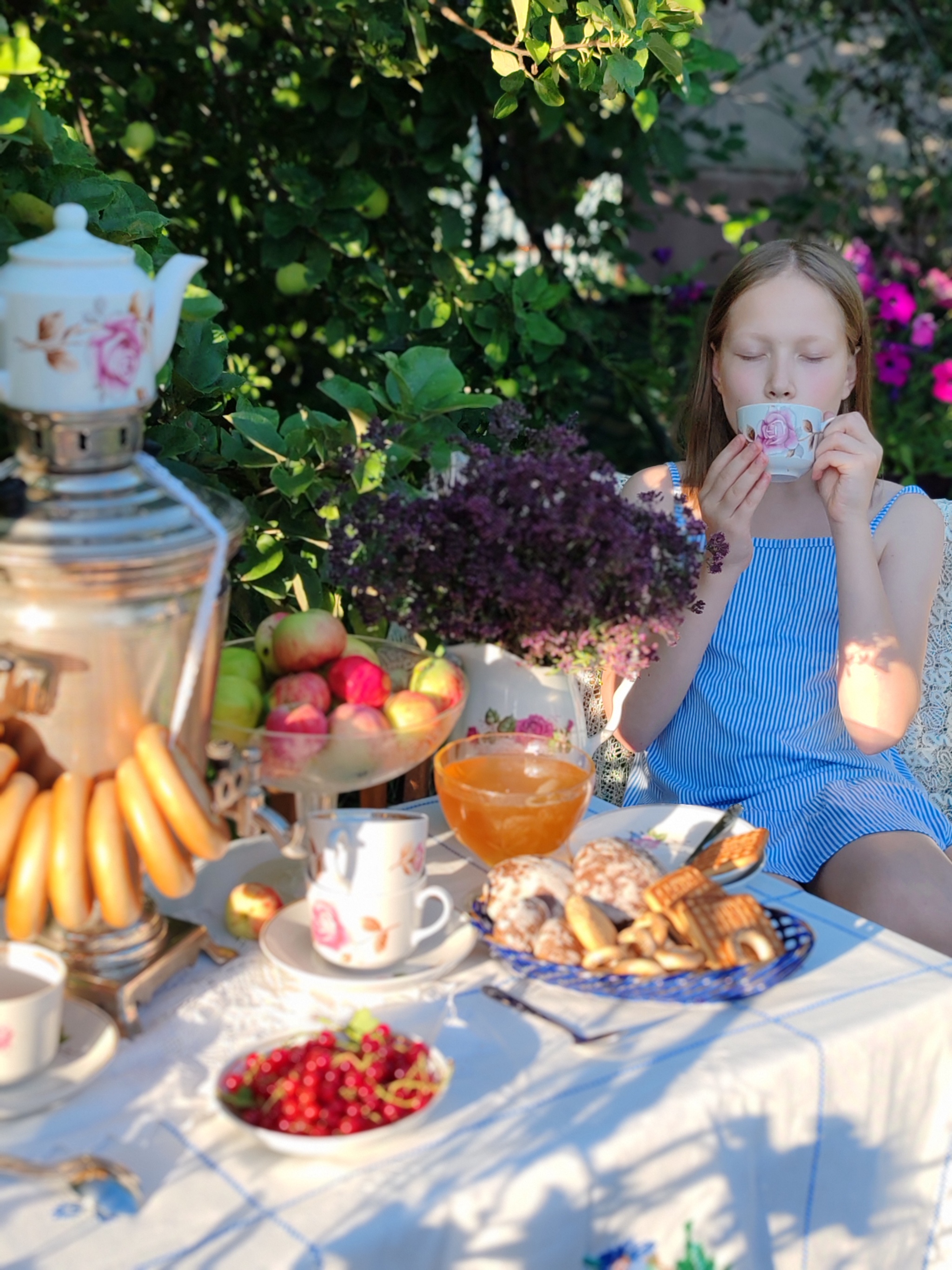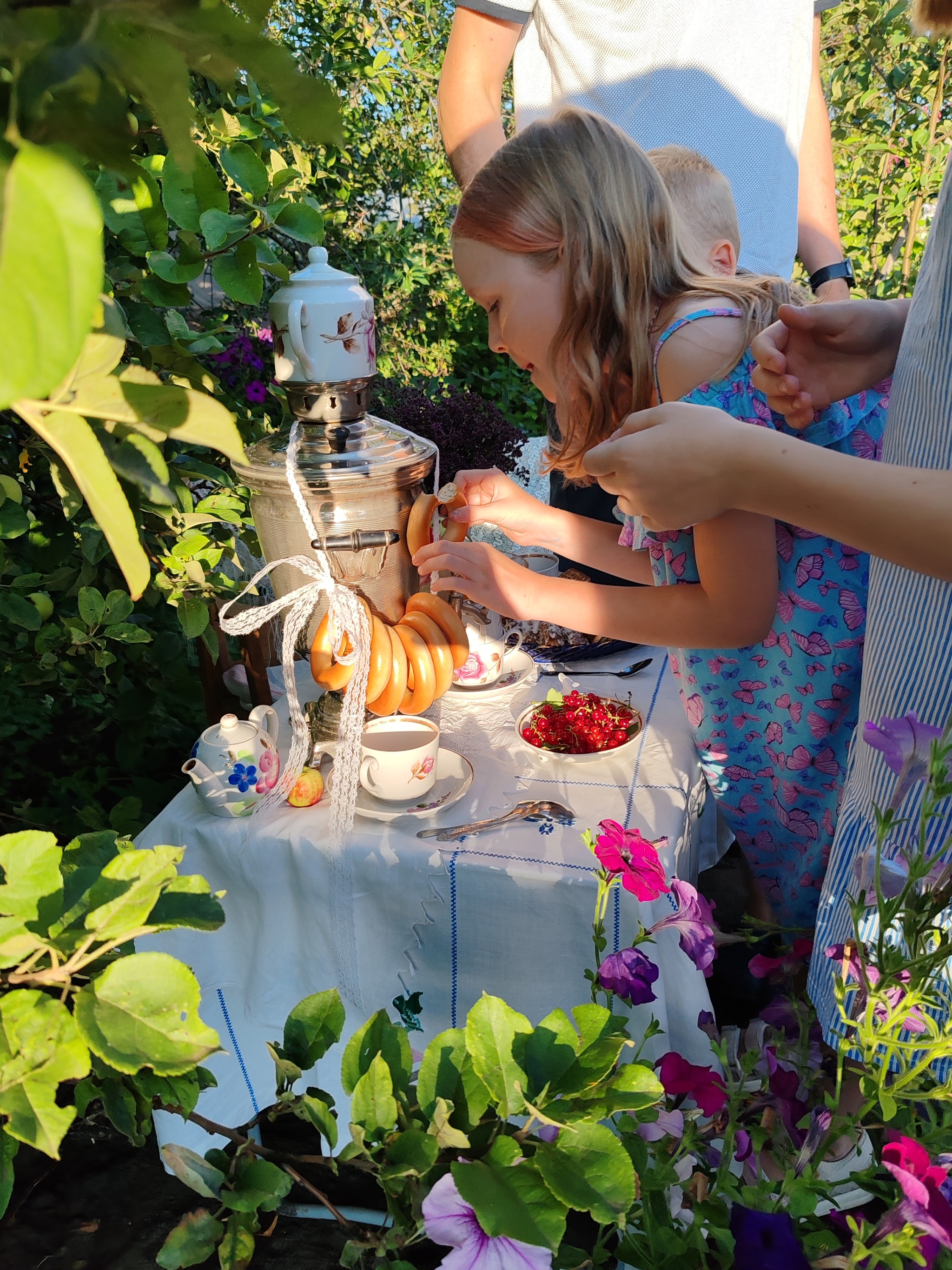 Гостили в этом году двумя семьями, где по 2ое внуков нашей героической бабушки, а всего у неё их 15! У Тамары Ивановны 6 детей и эти руки вырастили их в любви, а теперь не могут остановиться и ухаживают за домом и садом. Было решено создать уютную зону с домашним убранством и нафоткать бабушку как минимум с внучками, а мальчишки были у нас запасным планом, надежды усадить их за стол, где пока ничего нельзя есть, а только улыбаться, было крайне мало)