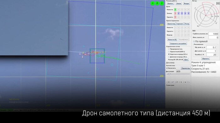 Так на демонстрируемом видео наземная установка с установленным пехотным пулемётом ПКТ открывает огонь по обнаруженному fpv-дрону и очень быстро его сбивает. В источнике указано, что в ходе проверочных боевых стрельб были эффективно подавлены две различных воздушных мишени – малоразмерный fpv-дрон и классический беспилотник самолётного типа. Первый был уничтожен с расстояния в 340 метров, а второй – с дистанции 450 метров.