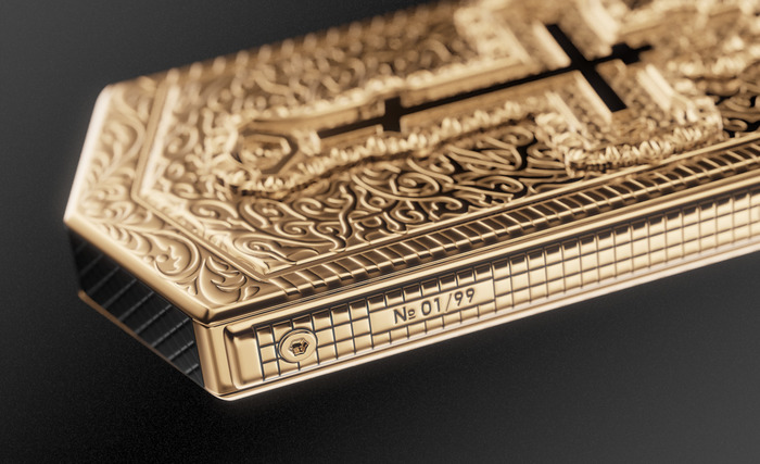 Корпус устройства покрыт золотом и украшен крупным православным крестом на фоне орнамента в древнерусском стиле. Передняя панель также обрамлена золотым витиеватым узором.