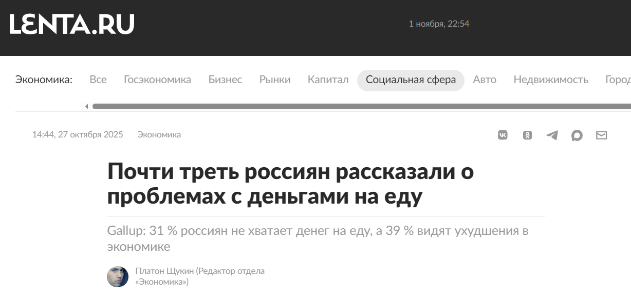 Впрочем, кто сказал, что статистика должна совпадать с реальностью? Официально доходы выросли на 8.5%, зарплаты на 4,4% — такие данные приводит Росстат. Красиво звучит, правда? Только вот каждый третий россиянин (31%) жалуется, что денег на еду не хватает — таковы результаты опроса Gallup. Наверное, они просто неправильно читают свои платежные ведомости и чеки в магазинах. Может, им объяснить, что они богатеют, просто не замечают этого за пустеющими холодильниками?