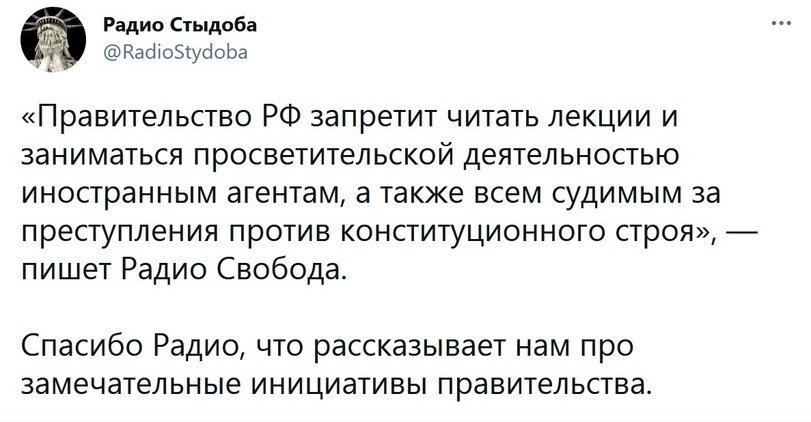 Правительство России запретит преподавать и читать лекции вне образовательных учреждений людям без опыта преподавания, должникам по налогам и штрафам, судимым по ряду статей УК РФ, а также включенным в список «иностранных агентов» лиц.