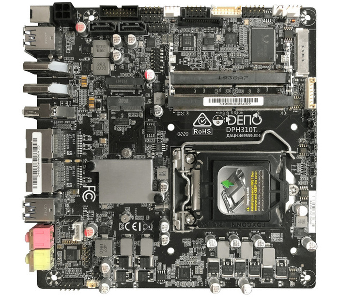 Плата построена на чипсете Intel H310C, располагает процессорным разъёмом LGA 1151v2 и совместима с процессорами Intel Core восьмого и девятого поколений в соответствующем исполнении. На новинке имеется пара слотов для модулей памяти DDR4 SO-DIMM, два слота M.2 (для SSD и модуля Wi-Fi) и пара портов SATA III. Слота PCIe для видеокарты здесь нет, что и не удивительно для платы, предназначенной для моноблока.