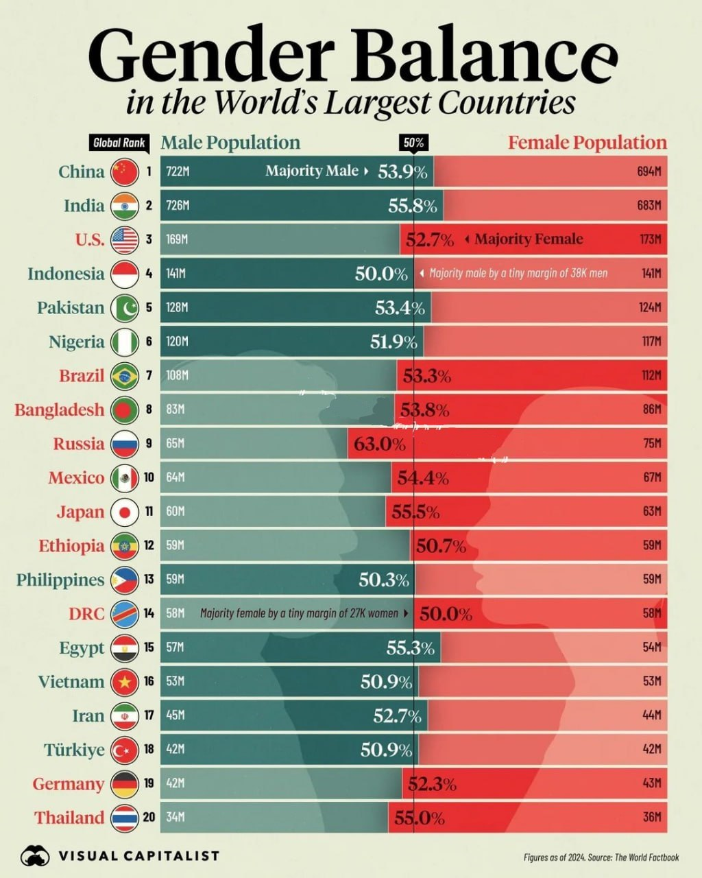 Мужчины во всем мире становятся «исчезающим видом», это следует из статистики компании Civixplorer. Согласно статистике, количество женщин преобладает над количеством мужчин, и, к большому сожалению, больше всего эта диспропорция зафиксирована в России.