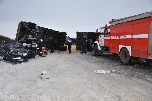 По предварительным данным, водитель грузовика КамАЗ с прицепом выехал на встречную полосу и столкнулся с Lada Granta. В результате ДТП две пассажирки легковушки погибли на месте, а водитель был госпитализирован с различными травмами. Водитель грузовика получил ушибы и ссадины.