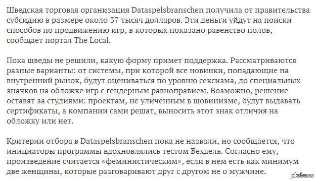 Slivkin В Швеции поощрят гендерное равноправие в играх 11 лет назад Что то весёлые новости сегодня, нажраться хочется, пошёл я в гараж http://lenta.ru/news/2014/11/17/swedengames/ Политика Идиотизм Деградация Имбецилы Тупость Фекалии
