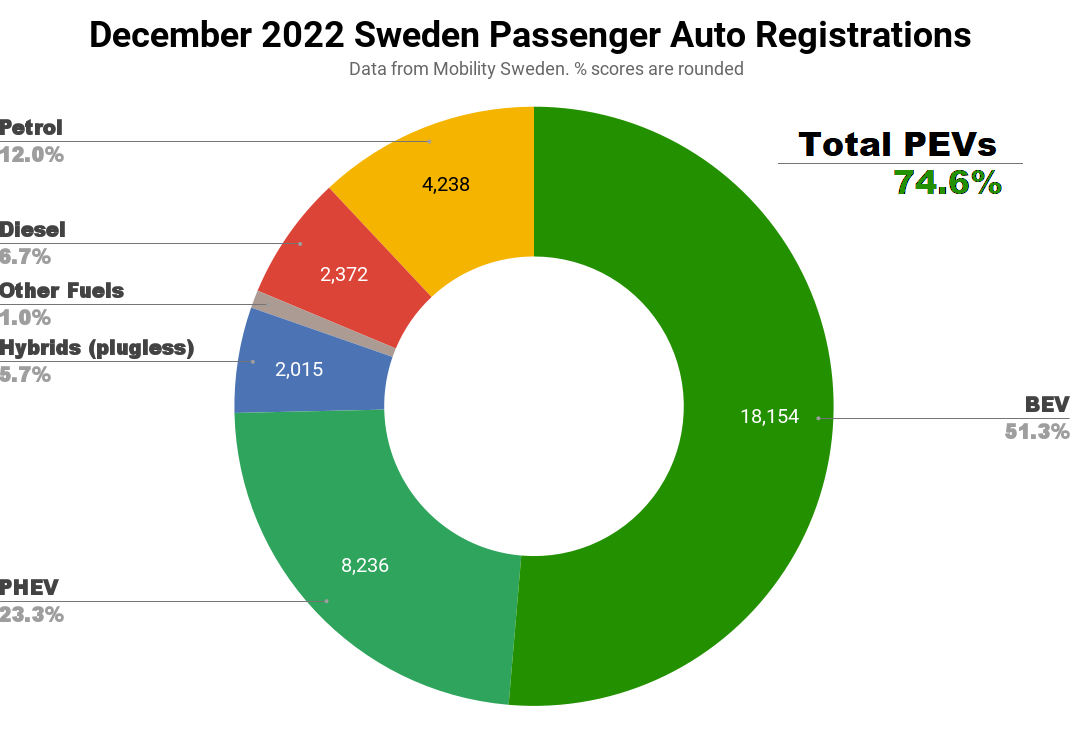 И третьей страной является Швеция в декабре электромобили заняли 75% рынка продаж. Рост продаж электромобилей составил 81%, доля ДВС сжалась до 18,7%