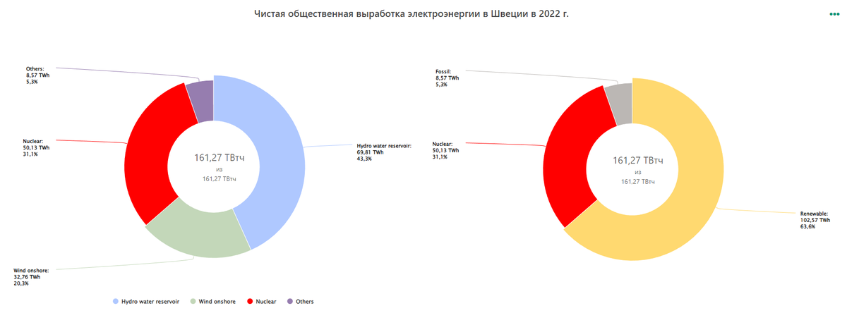 Швеция, как и Норвегия не использует ископаемый уголь и газ в своей генерации. Доля возобновляемой энергетики составляет 63%, ветер + гидрогенерация, АЭС занимает 31%, остальная энергия поступает от мусороперерабатывающих заводов.