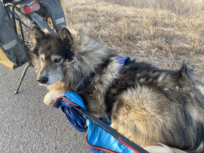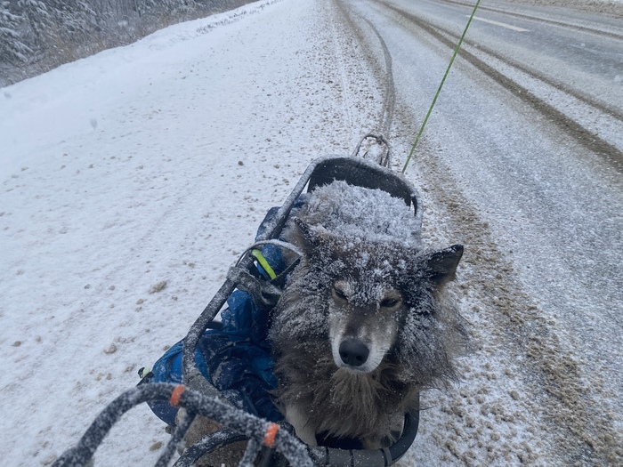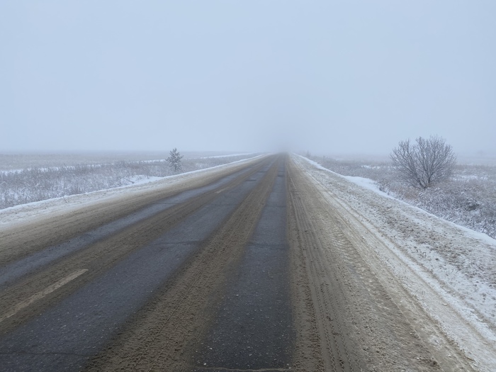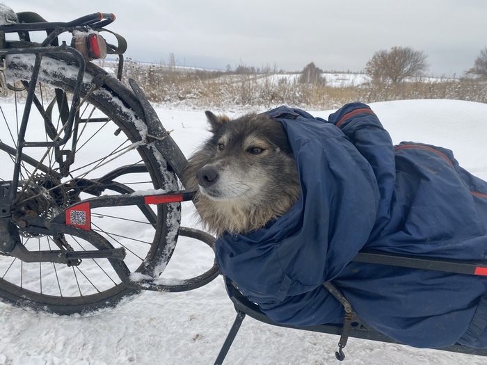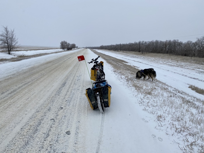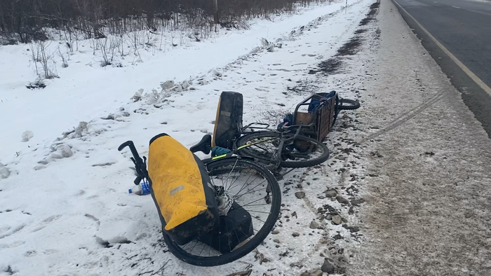 Захотелось посмотреть, а как зимой в России, потому что я всегда был летом, увидел. По федералкам не чищенные дороги, обочина вся в грязном мягком снегу. Но ладно были бы тогда сельские дороги, но их оказалось не так уж и много, поэтому приходилось тянуть Шарика в прицепе. Если что Шарик весит 27 кг, прицеп 12 кг и две сумки на прицепе 10 кг, в общем примерно сзади у меня 50 кг груза, когда я вешу 54 кг. (так же есть ещё две сумки на велосипеде, это еще как минимум 10 кг)