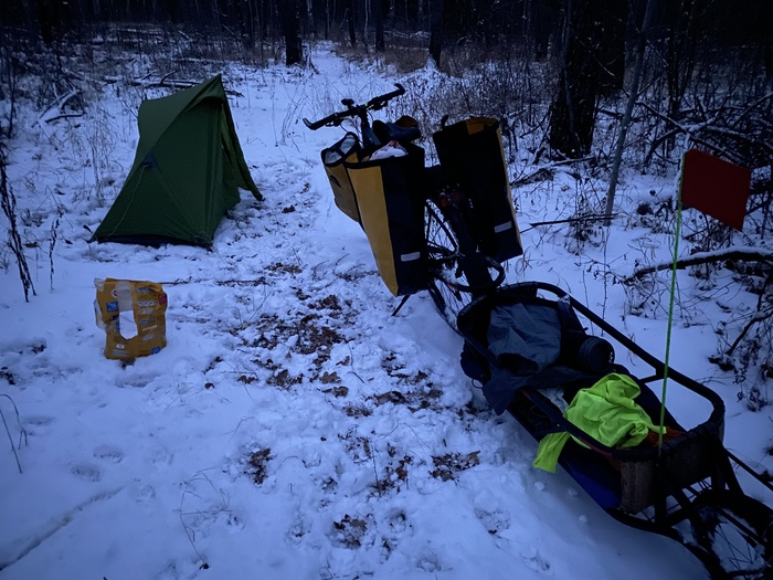 Ночевка зимой в палатке проходит как и летом примерно. Только я забирал спальник с прицепа и ложил под палатку