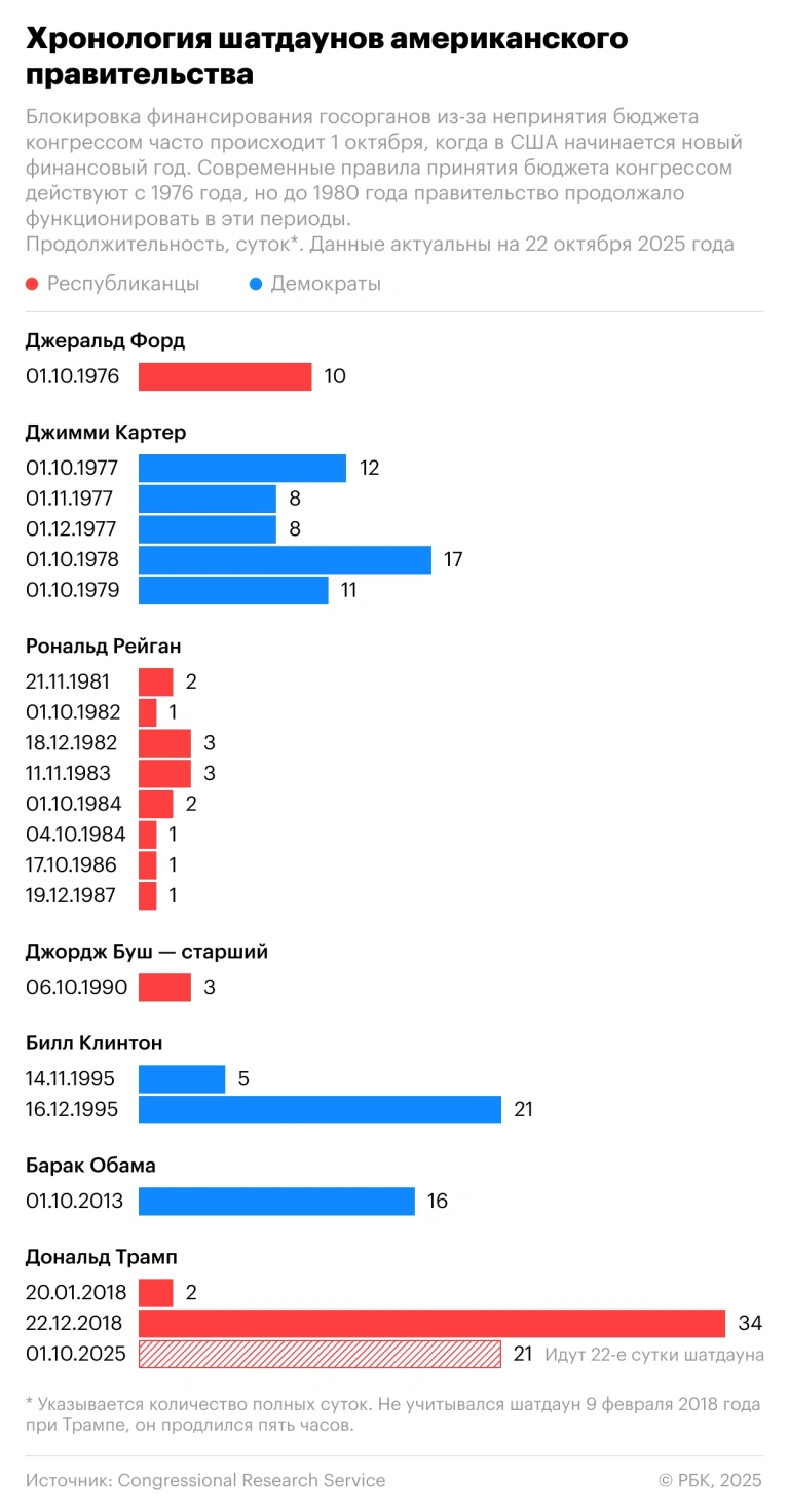 22 октября президент США Дональд Трамп установил рекорд по суммарной продолжительности шатдаунов, то есть пауз в работе правительства и всех госучреждений, за оба президентских срока. Нынешний шатдаун начался 1 октября в 00:01 по восточному времени (07:01 мск), он продолжается уже 22-ые сутки. Во время его первого срока правительство приостанавливало свою работу в общей сложности на 36 суток. Таким образом, в сумме длительность всех шатдаунов при республиканце составила уже 57 суток (предыдущий рекорд — 56 — был установлен демократом, 39-м президентом США Джимми Картером).