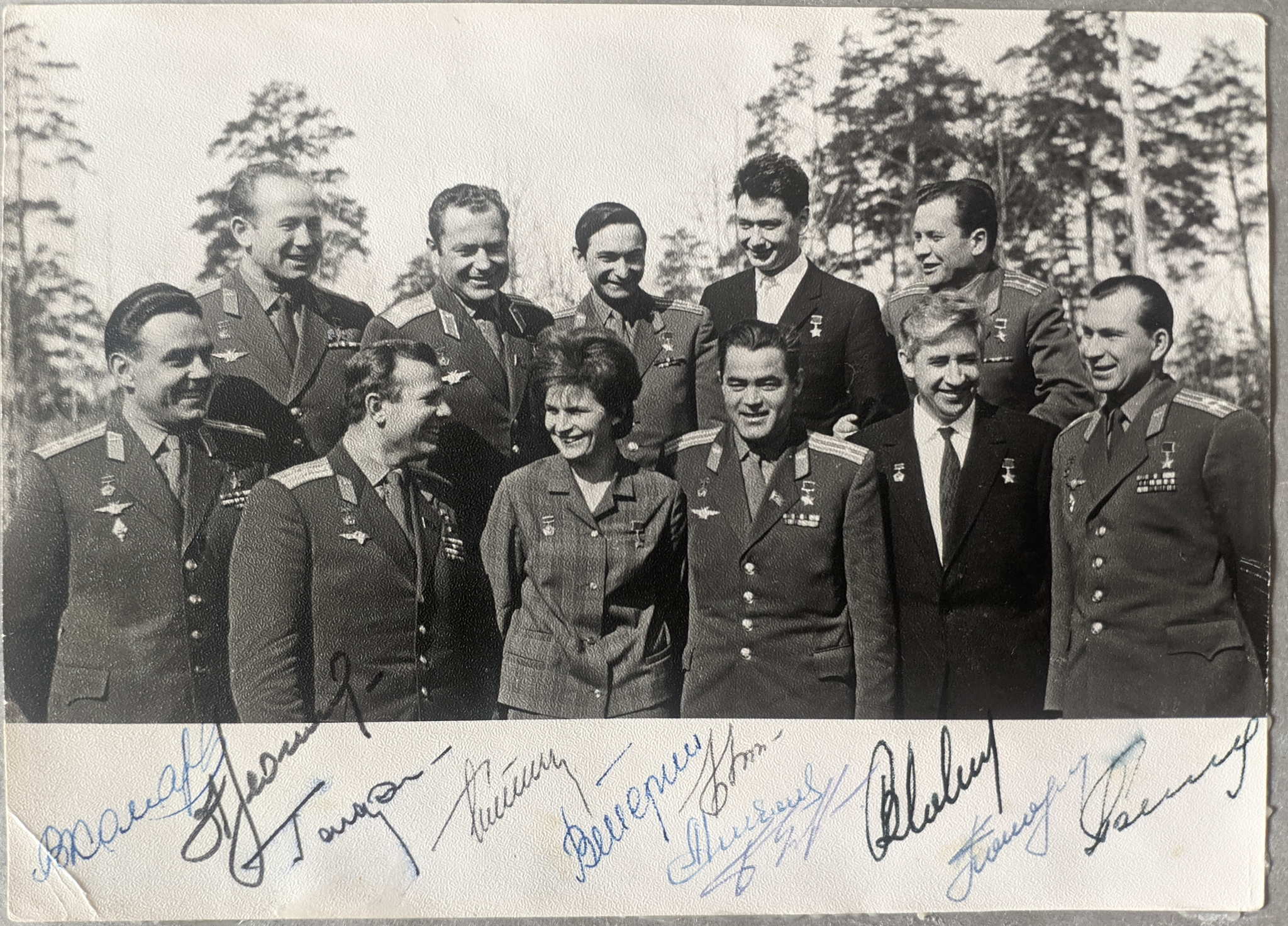 В первом ряду: Владимир Комаров, Юрий Гагарин, Валентина Терешкова, Андриян Николаев, Константин Феоктистов, Павел Беляев. Во втором ряду: Алексей Леонов, Герман Титов, Валерий Быковский, Борис Егоров, Павел Попович.