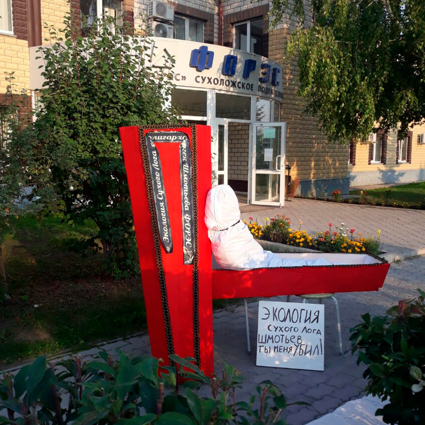 Символический гроб активисты доставили к проходной завода компании "Форэс" который является главным загрязнителем экологии в городе. Таким нестандартным образом жители в очередной раз попытались привлечь внимание общественности и властей к их проблеме.