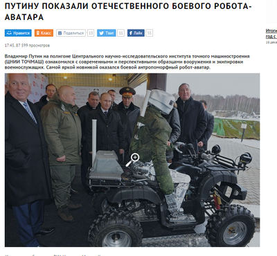 самое смешное, что сейчас включил новости и показывают - Россия, полигон, Путин смотрит на российскую разработку, на квадроцикле едет робот похожий на человека (которым управляют из далека) и стреляет