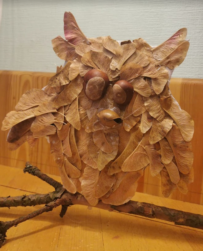 Единственное, что должен заметить: не надо было использовать много ПВА. Клеили с утра, чтобы за день успело высохнуть - она лежала, и вроде бы клей подсох. А когда вечером смонтировали её на ветку и оставили в вертикальном положении - незастывший ПВА потёк из-под перьев, сделав сову похожей на Нургла. Хорошо, что делали с запасом по времени - за выходные всё просохло.