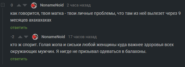 вот я и высказал свою точку зрения, что если ты не готова трахаться со всеми подряд, то не надо лишний раз соблазнять всех подряд, оголяться чрезмерно. А про меры и границы необходимо договариваться в обществе заранее, чтобы учитывать интересы всех членов общества, а не только той части, которая "хочет быть желанной". Есть племена, где спокойно нагишом ходят и всё норм, но мы не в таком племени живем и декольте, глубокие разрезы это всё-таки часть сексуальной провокации, на которую не все окружающие давали согласие, и даже больше того, их так легко завиноватить, обвинить (даже, внезапно, в педофилии), если они поведутся на неё. И теперь вопрос: зачем специально сексуально провоцировать окружающих тебя мужчин? А может окружающие мужчины не хотят видеть столько обнаженного тела? Или кроме тела больше нечем привлечь внимание.... а главное, зачем? для чего?