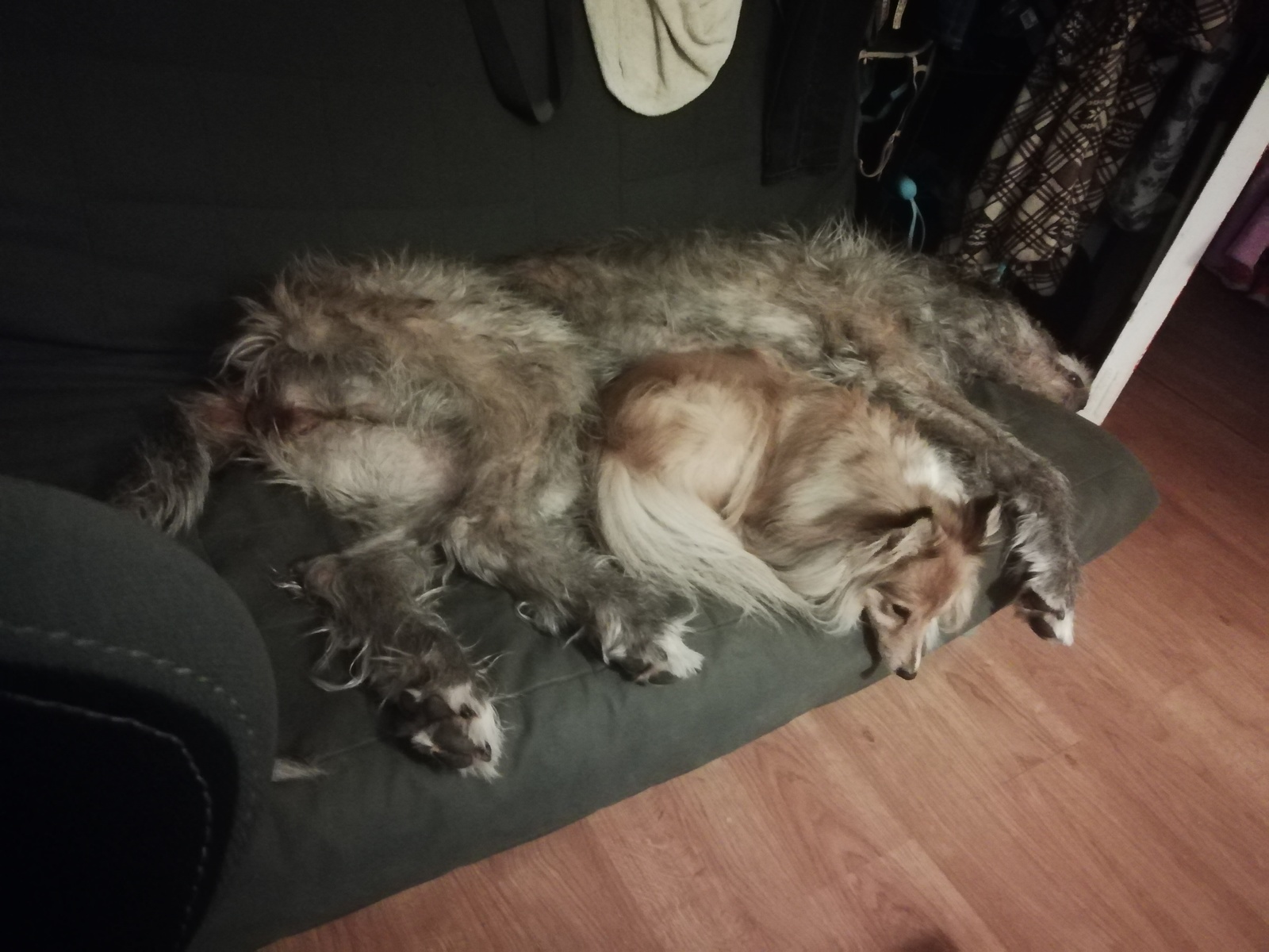 У нас на тот момент ещё небыло кровати, спали на надувной матрасе на полу. Зато собаки в комфорте, чо.