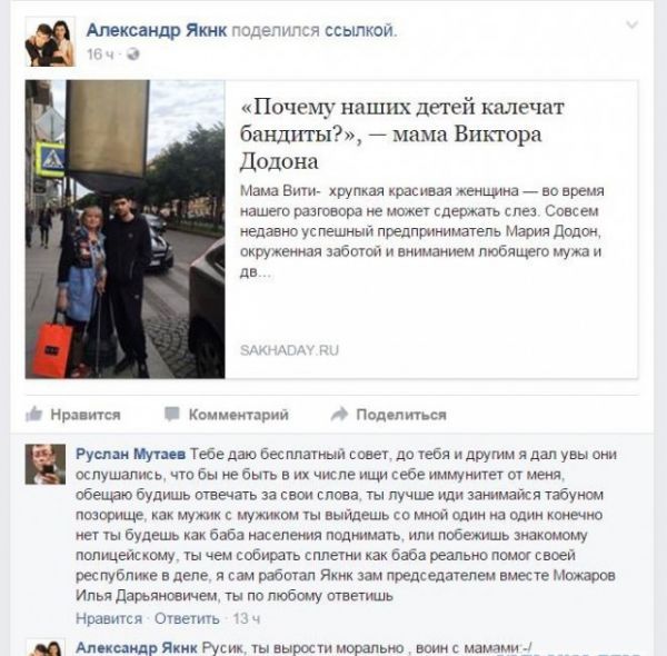 За потерпевшего и его семью вступился Александр Захаров из общественной организации ЯКНК. Он попытался довести действия Мутаева до Рамзана Кадарова и сказал, что его поведением возмущены пресс-секретарь главы Чечни Альви Ахмадович и директор департамента внешних связей Главы и Правительства Чеченской Республики Иса Хаджимурадов.