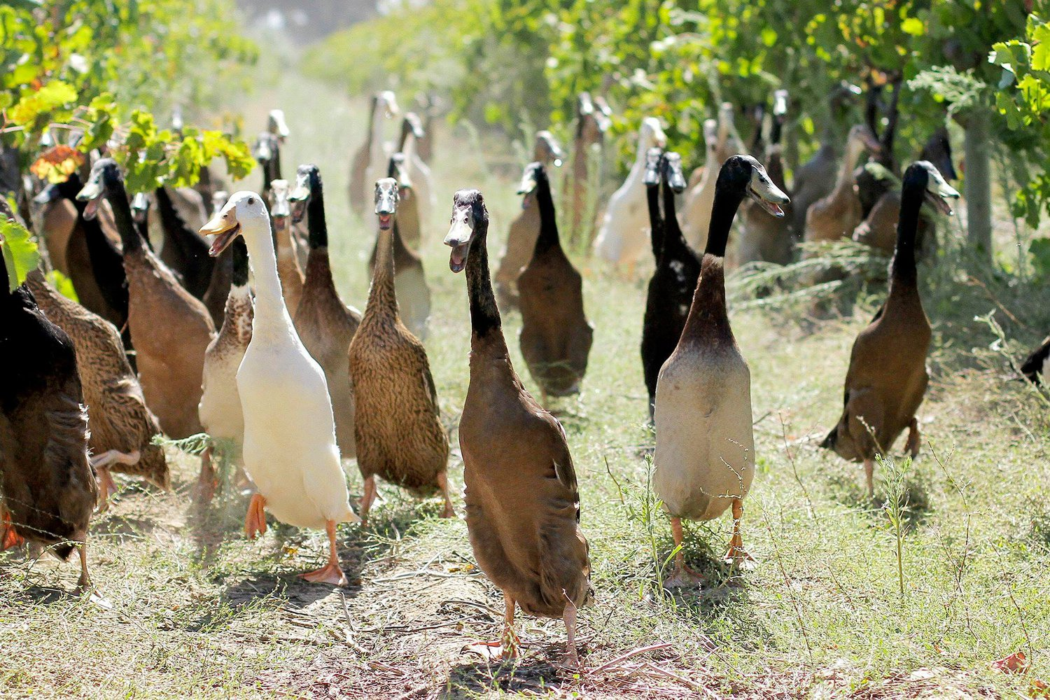 Но брать первую попавшуюся утку на ответственную работу не стали — выяснилось, что лучше всего с задачей справляется индийский бегун (Indian Runners), одна из пород домашней утки. Как и следует из названия, её отличает походка — она передвигается довольно быстро, а не вразвалочку. Ещё одна ее особенность — высокая яйценоскость. Обратив внимание на то, что утки питаются улитками, владельцы Vergenoegd Löw The Wine Estate стали устраивать «парады уток»: сотни особей наперегонки ищут пропитание среди побегов винограда.