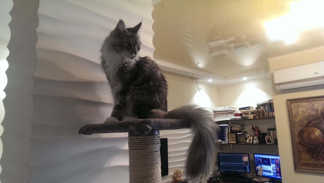 Серебристые мейн-куны обычно чуть меньше по размеру, но эта выросла в крупную семикиллограмовую животину. Без жира, само собой.