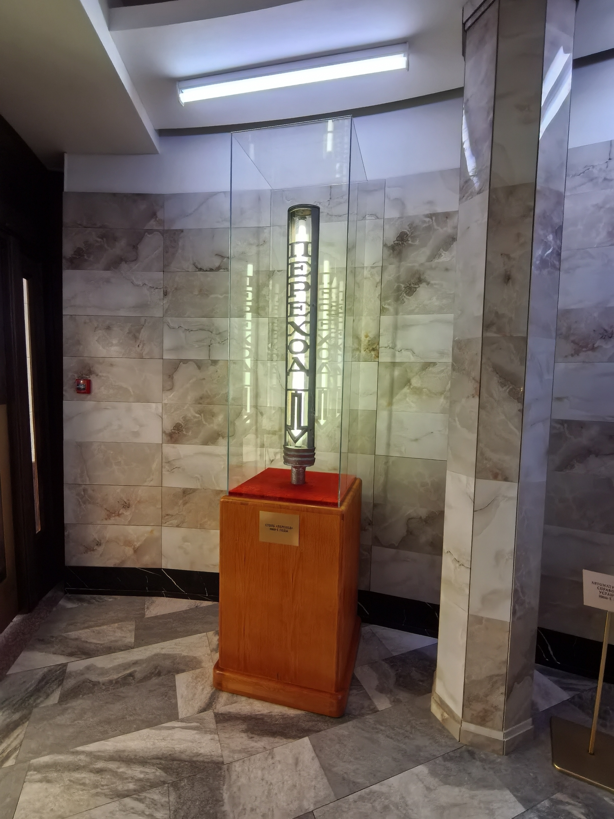Внутри вестибюля мы можем наблюдать полукруглый кассовый зал станции и на нём располагаются старые артефакты и экспонаты тех лет. Начинается всё со светового указателя "Переход". Если в переходе был подземный вестибюль метро, то на указатель вешали сверху знаменитую букву "М" (причём они тоже разные были).
