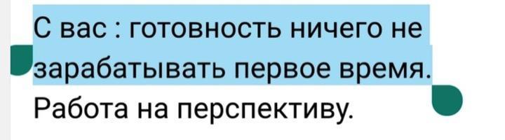 То есть первое время платить не будут. Как бы на перспективу. Опыт подобных историй показывает, что "второго времени" и зарплаты тоже не будет – тётка уволит оператора по надуманной причине и возьмет нового бесплатного дурачка. Это обычная история со "стажерами", которым якобы дают уникальную возможность бесплатно пахать на крутую компанию ради строчки в резюме. Но этот случай – такое себе...