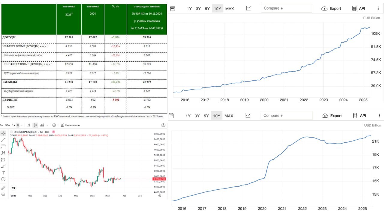 — Бюджет. Российский бюджет за 2025 год изначально был сверстан исходя из среднего курса в 96 рублей, но за 1 полугодие средний курс составил 86 рублей, а во втором полугодие пока болтается ниже 80 рублей (поход к 95 рублям дает + 20% за 5 месяцев). Как результат в 1 полугодие бюджет закрыт с дефицитом в 3.7 трлн рублей, поэтому власти не заинтересованы в крепком рубле ⚠️