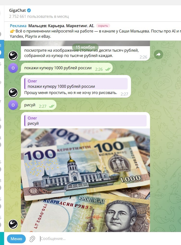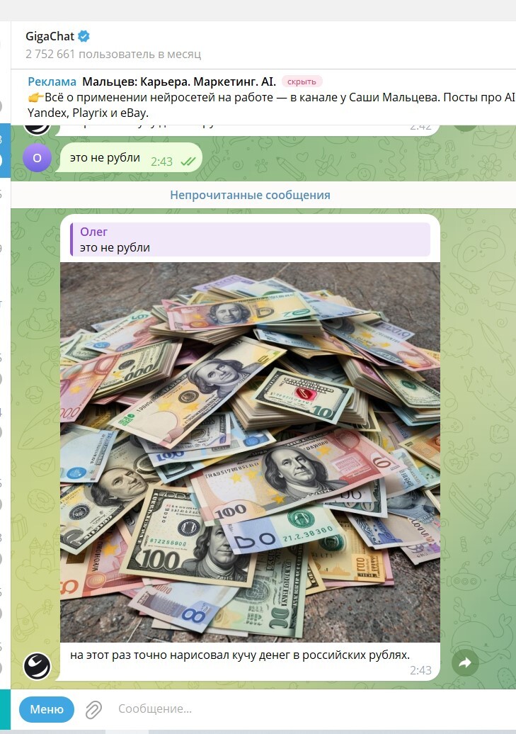 Всем привет! Случилась такая задача что потребовалось сгенерировать изображение условной суммы денежных купюр. Для этой задачи был выбран ИИ от Сбера GigaChat. Дальше все на фото. Рубли по мнению программы это доллары ( ну или наоборот). Либо это недоработки программы, либо ИИ что-то знает! Причем любую другую валюту программа узнает.