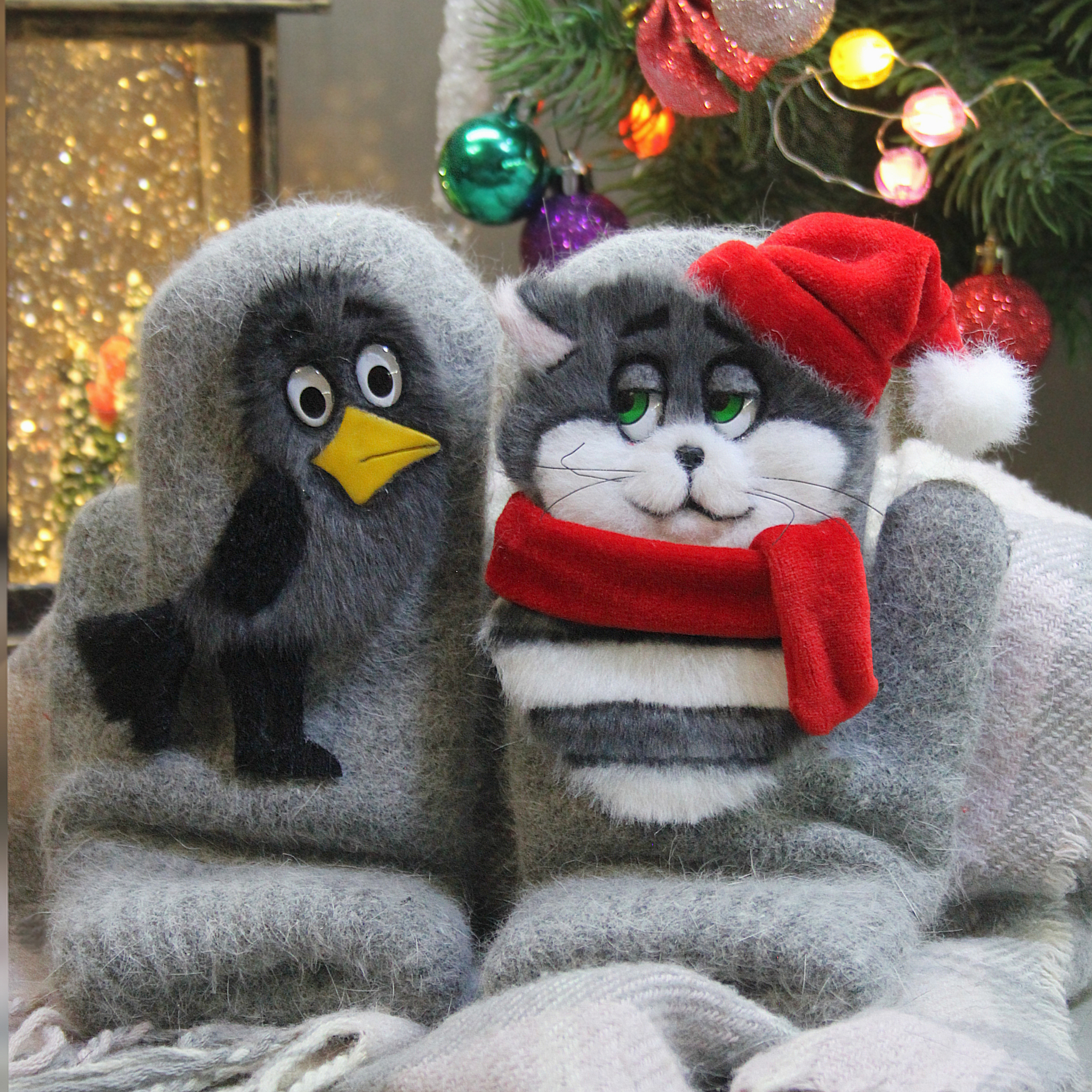 Выполнены из искусственного меха. Нос и клюв из полимерной глины, усы из лески. Шапка и шарф из ткани. Глаза -стеклянные кабошоны.