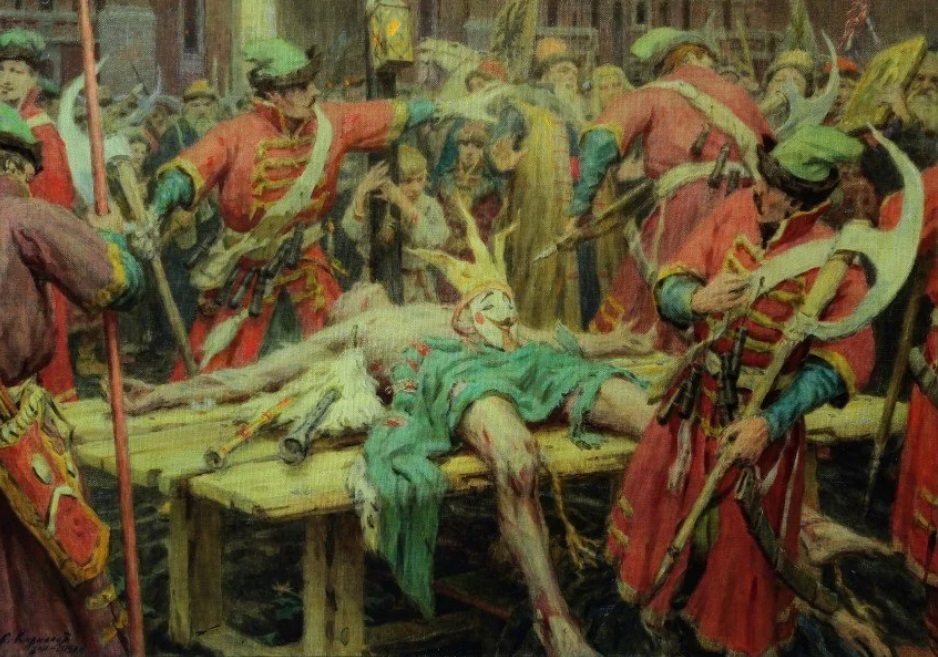 Тела убитого царя и его приближенного Петра Басманова приволокли на Красную площадь. Поравнявшись с Вознесенским монастырём, где жила Мария, Нагая толпа вновь требовала от нее ответа — её ли это сын. По свидетельству современников, та дала такой ответ: «Об этом надобно было спрашивать, когда он был жив, а теперь он уже не мой». Тела решено было подвергнуть «торговой казни». В течение первого дня они лежали в грязи посреди рынка. На второй день тело Дмитрия положили на прилавок, на грудь ему бросили маскарадную маску, в рот воткнули дудку, а под прилавок бросили труп Басманова. В течение трех дней москвичи всячески надругались над телом бывшего царя. У растерзанного трупа читали «грамоту» о жизни Григория Отрепьева в монастыре и его бегстве.