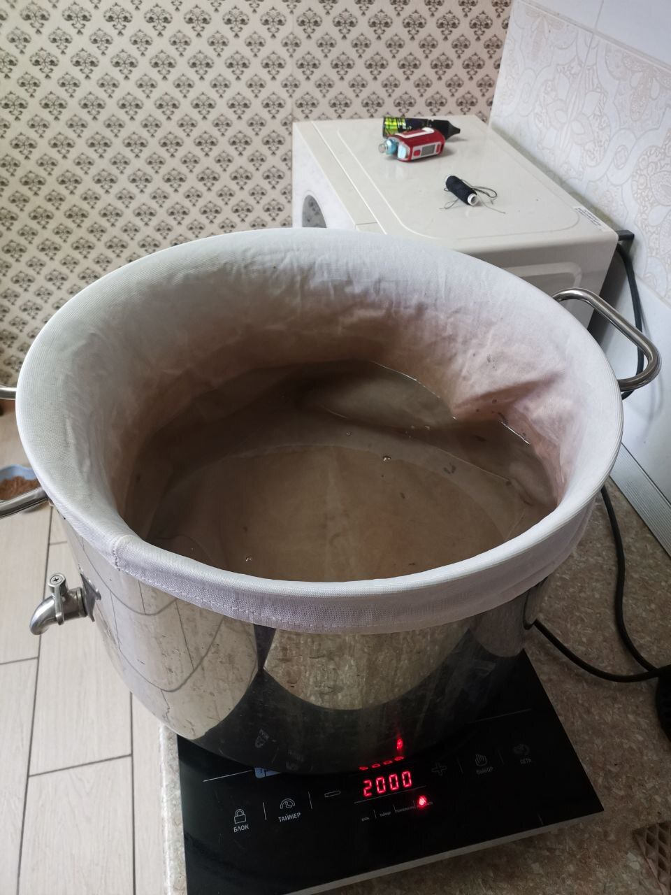 Если у вас обычная кастрюля, без крана, ничего страшного – уберите мешок с солодом из кастрюли, слив из него воду, перелейте воду из кастрюли в пластиковую бочку, поместите мешок снова в кастрюлю, промойте солод оставшейся водой.