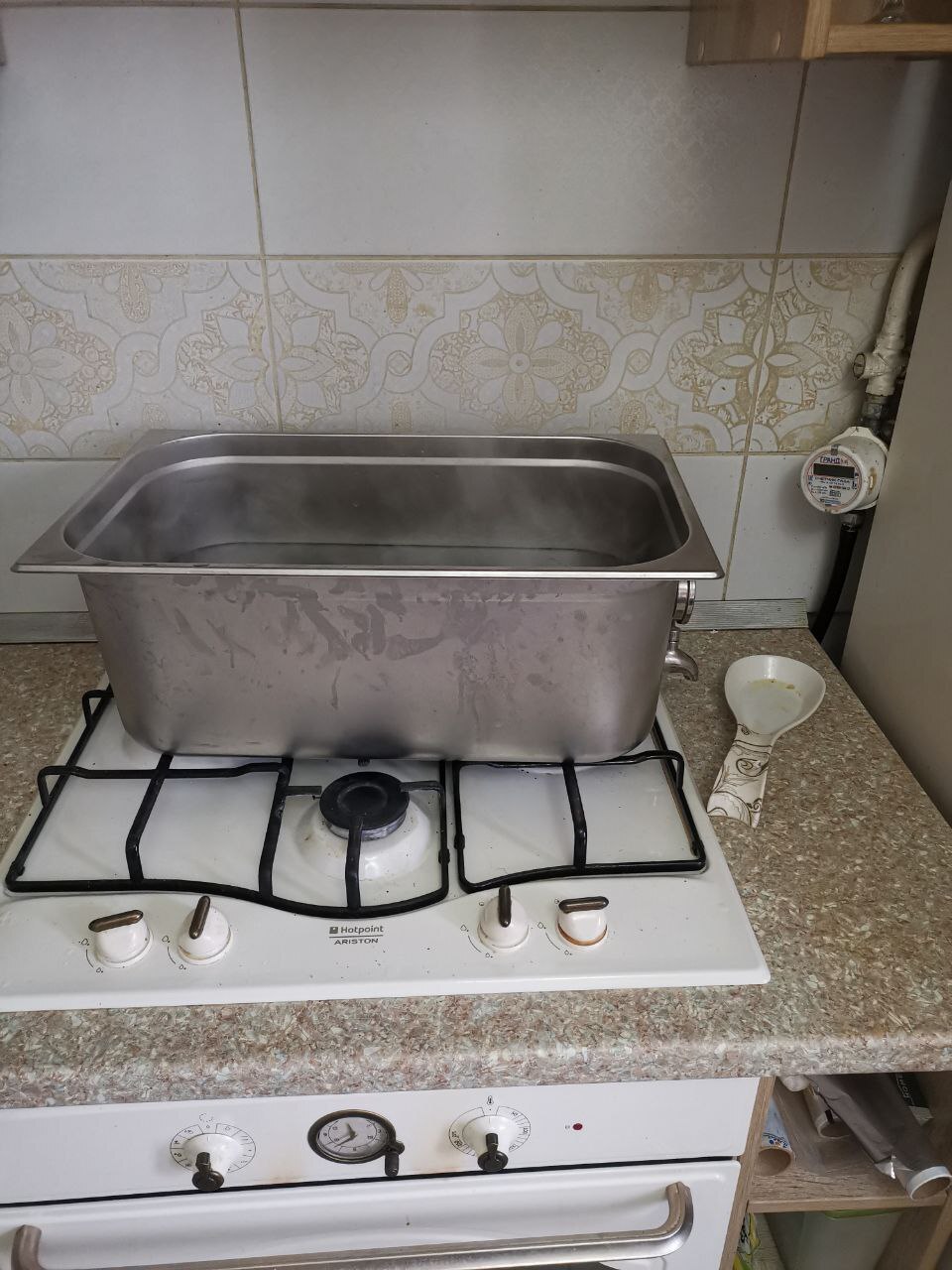 В это время, греем еще 18 литров воды, до кипения. В этот момент и пригодится вторая кастрюля. Лично я для этого использую гастроемкость, но не суть, подойдет любая ёмкость.