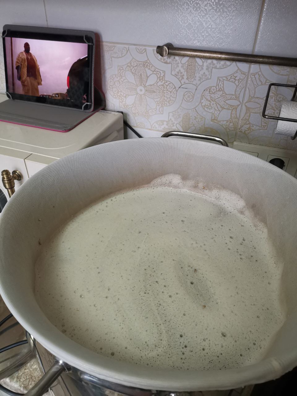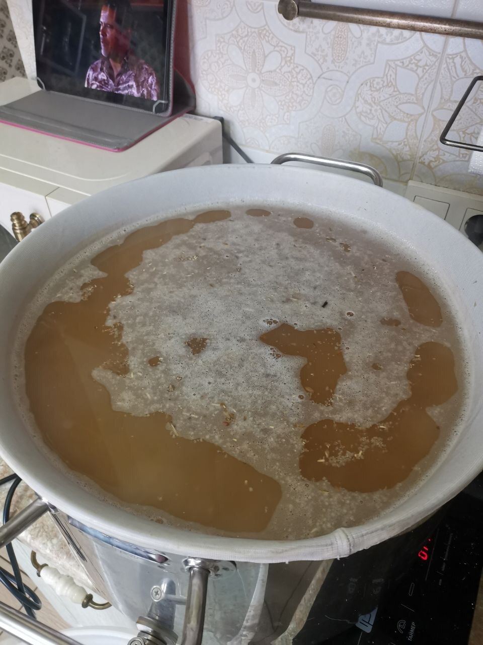 Вот, сусло начинает закипать, потом эту пену нужно будет убрать.