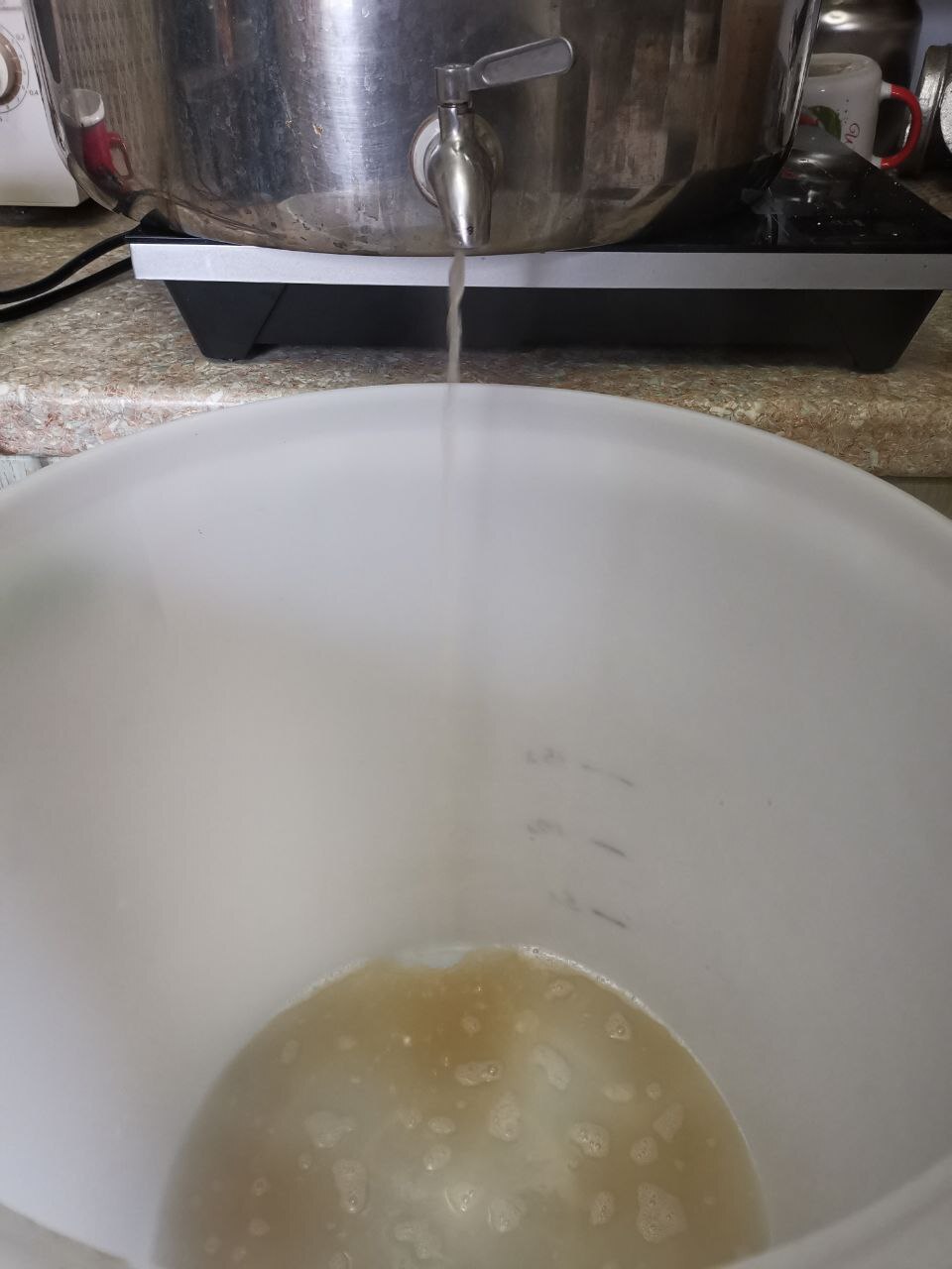 На этот раз, ничего не мешаем, достаем пластиковую бочку и начинаем сливать в него сусло через кран кастрюли. Я сливаю тонкой струйкой, чтоб сусло было все таки не таким мутным. При этом, первая пару литров, я сливаю в литровый мерный стакан и переливаю снова в кастрюлю, потому что первые литры слитого сусла очень уж мутные.