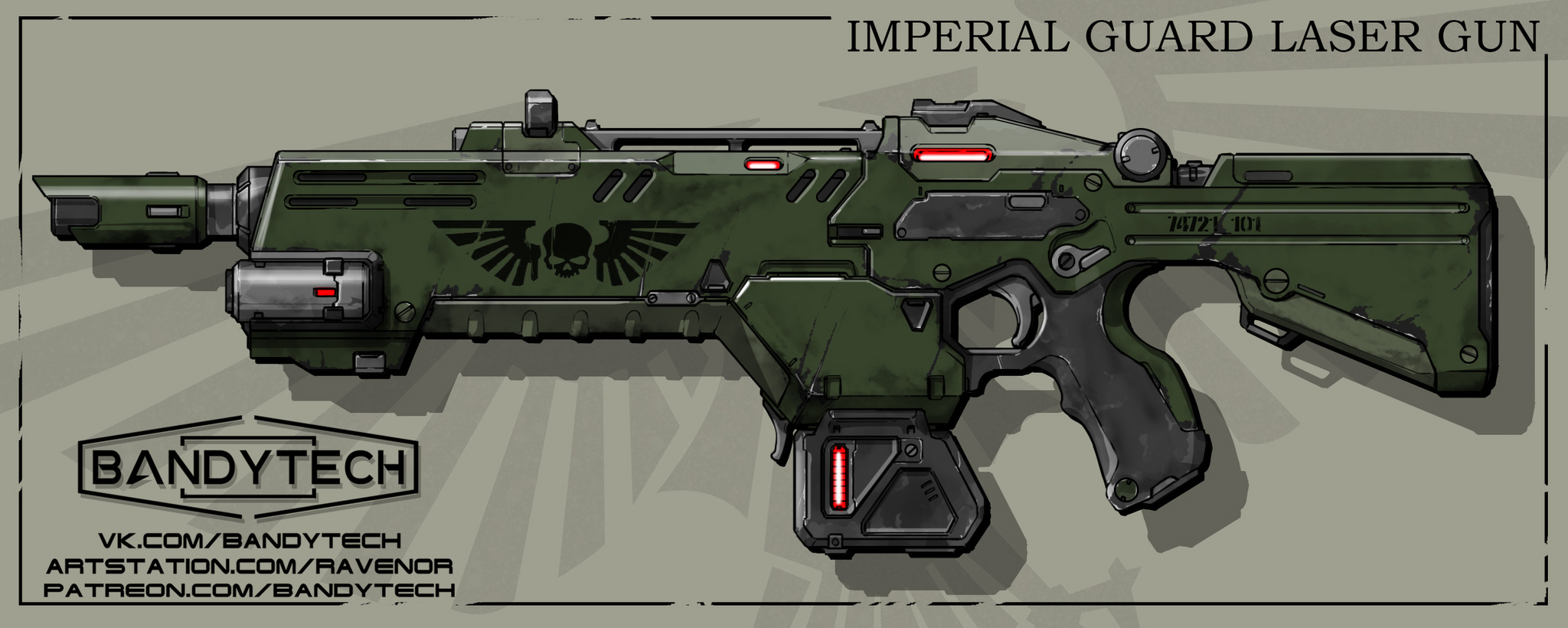 Так вот, моделей и вариаций там столько, что на отдельную лекцию хватит, но типичный лазган, как исходит из названия хуярит лазерными импульсами. Батарея меняется как магазин обычного пулевого оружия. Мощность импульса регулируемая, так что зарядов в батарее от 1 до сотни. Поражающий эффект средней мощности легко дырявит плоть насквозь, прожигает лёгкую персональную броню. К каждому лазгану полагается иметь штык, который весьма неплохо режет, но как ни крути, если приходится примыкать штыки - сдохнуть, вероятно, тоже придётся.