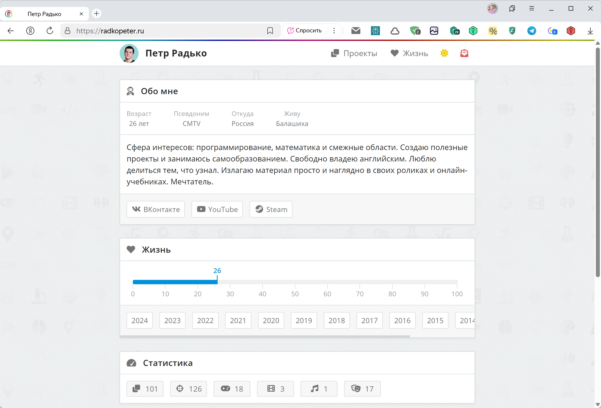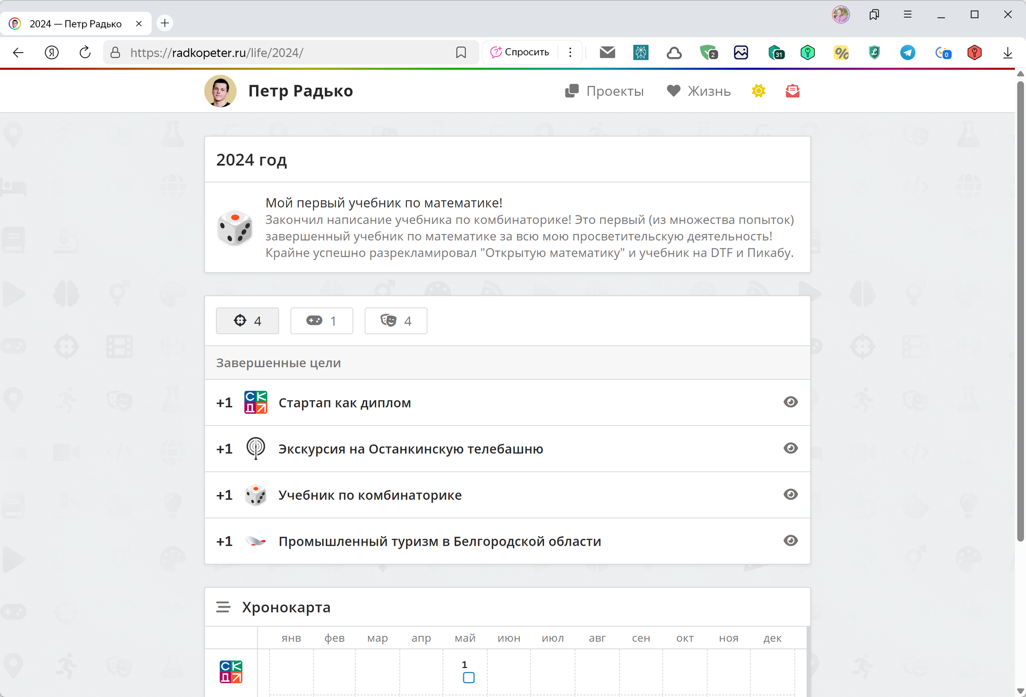 Итак, Пётр — программист, математик, автор учебников и видео, живёт в Балашихе. На своём сайте он не просто рассказывает о себе, а фиксирует все свои проекты: образовательные, рабочие, личные. У каждого — цель, сроки, прогресс. Например, “информатика”, “программирование”, “математика”, даже “отдых” и “игра” — всё это отдельные проекты с трекингом. Видно, сколько времени уделено каждому, какие результаты достигнуты. Интересно, что это не просто дневник — а открытая хроника, где любой посетитель может понять, чем занимался Пётр в определенный период. При этом ничего лишнего — только факты, цели, итоги, а где то еще описаны впечатления и переживания.