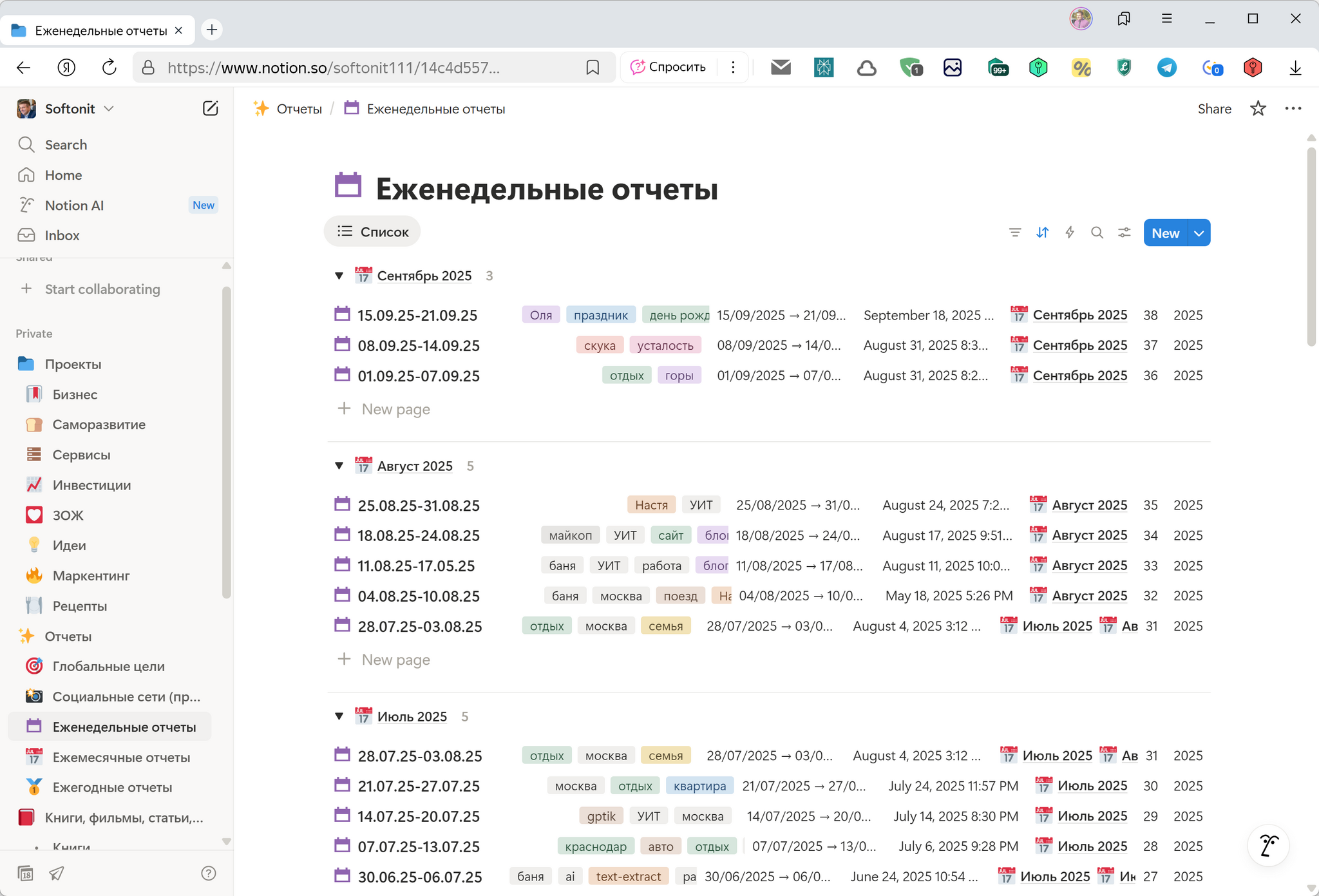 Каждую неделю делаю обзор прошедшей недели и фиксирую что я сделал из запланированного, что не получилось сделать, и пытаюсь понять почему. Пишу также о своем состоянии и эмоциях. Дополнительно, на отдельной странице в Notion мониторю все цели и фиксирую прогресс по ним, которые есть в данный момент. Цели не статичны и могут быть изменены / добавлены / удалены (если потеряли актуальность).