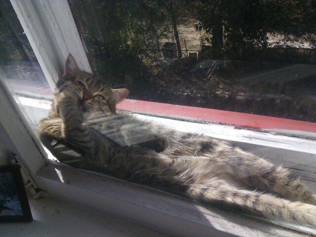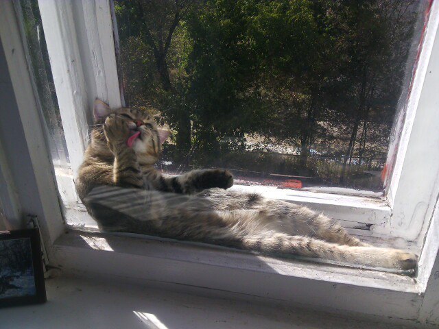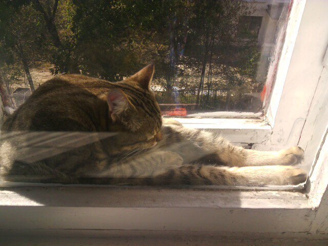 1094 Ceramist -Ваш кот застрял. 9 лет назад -Он не застрял, ему так удобно. Бонус в комментариях. [моё] Кот Окно Комфорт Усатый-полосатый