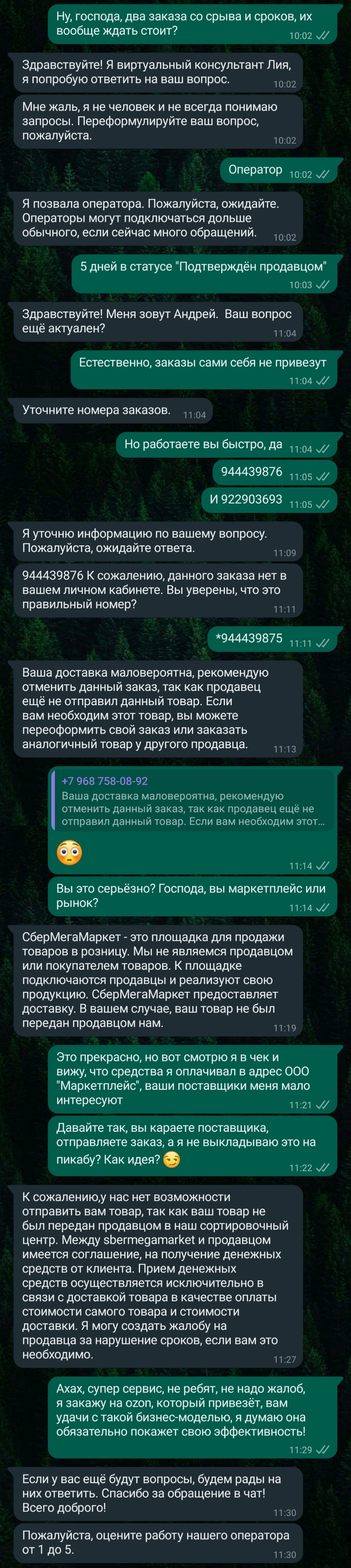 Звоню на их горячую линию, хамоватая бабонька сообщает что ей всё "Ясно". Ща отменит. Заботливо предлагает начислить бонусы за сложившуюся ситуацию. Не начисляет "по умолчанию" за хуёвый сервис, а спрашивает, надо мне или нет?! Естественно отказываюсь, потому что если на собеседовании меня спросят: "Кем я вижу себя через пят лет?", теперь я смело смогу ответить, что точно не покупателем СберМегаМаркета!