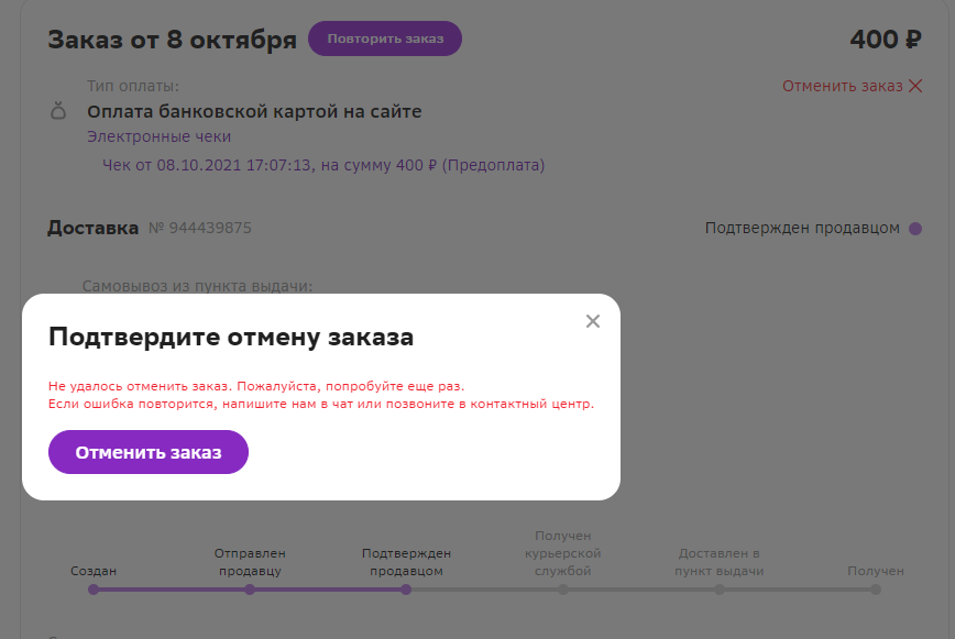 Ладно, едем дальше, захожу в ЛК, пытаюсь отменить оба заказа, ибо ждать бессмысленно. Иииииииии, хуй там.