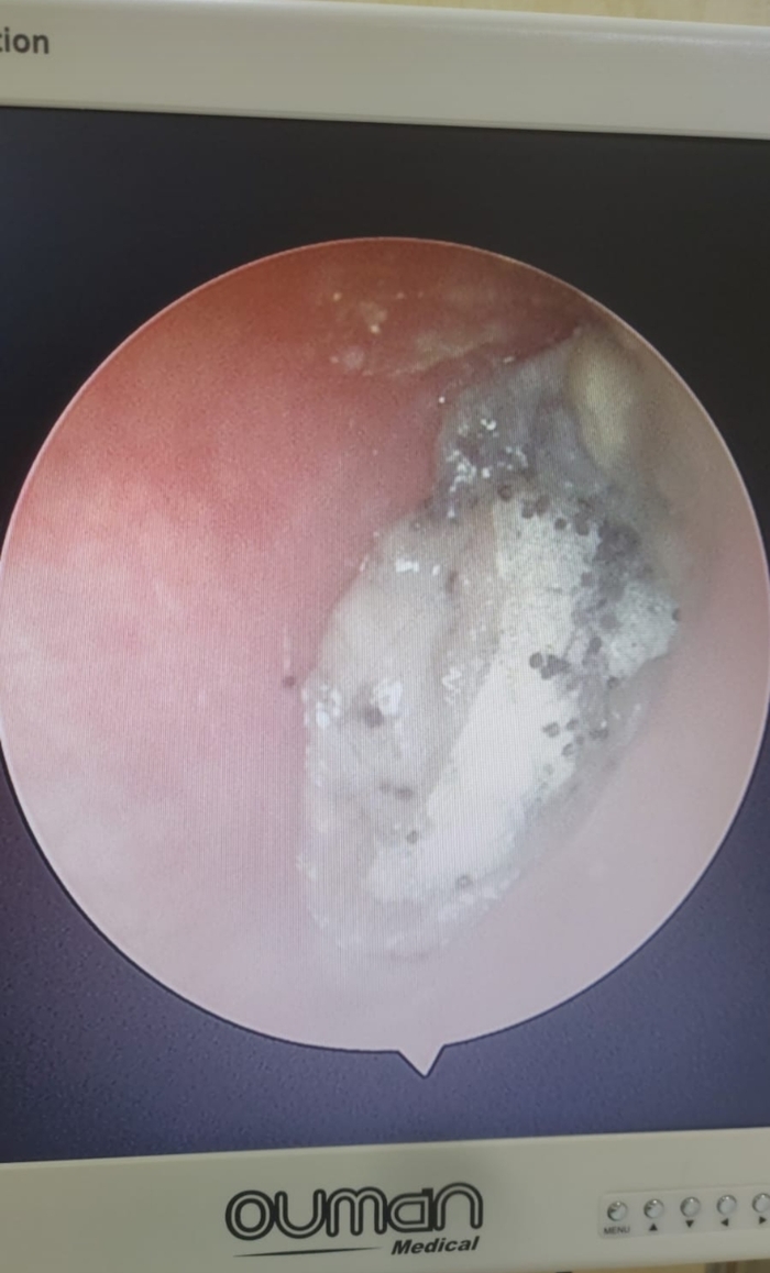 Тоже отомикоз, но уже немного другого рода- у мужчины микоз ногтей рук и ног, длинным, изящным специально отрощенным ногтем мизинца ковырял в ушах. Теперь грибок и в ушах. Красное пятно по центру- осаднение от ванной палочки.