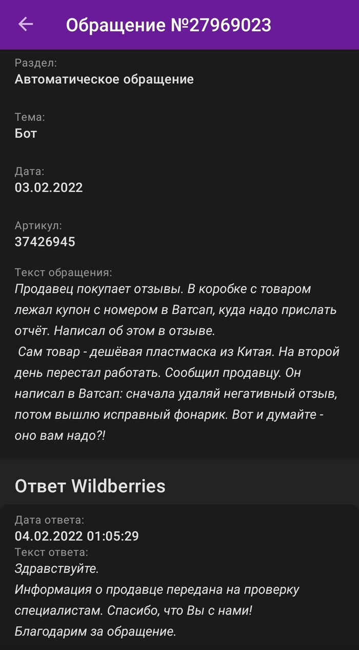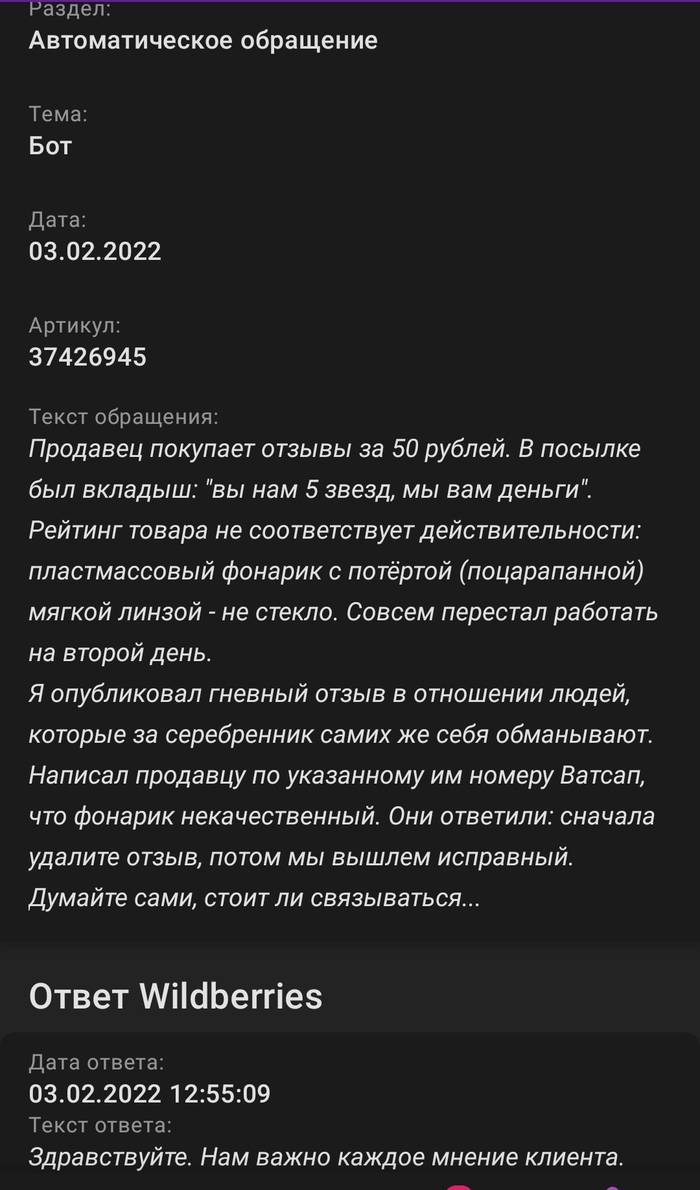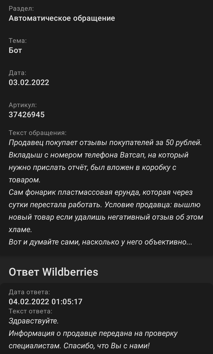 Ну а Вайлдберриз "крышует" своих продавцов, помечая жалобы с фотографиями как спам от ботов. Вот такая наглость. Будьте бдительны при выборе товаров!
