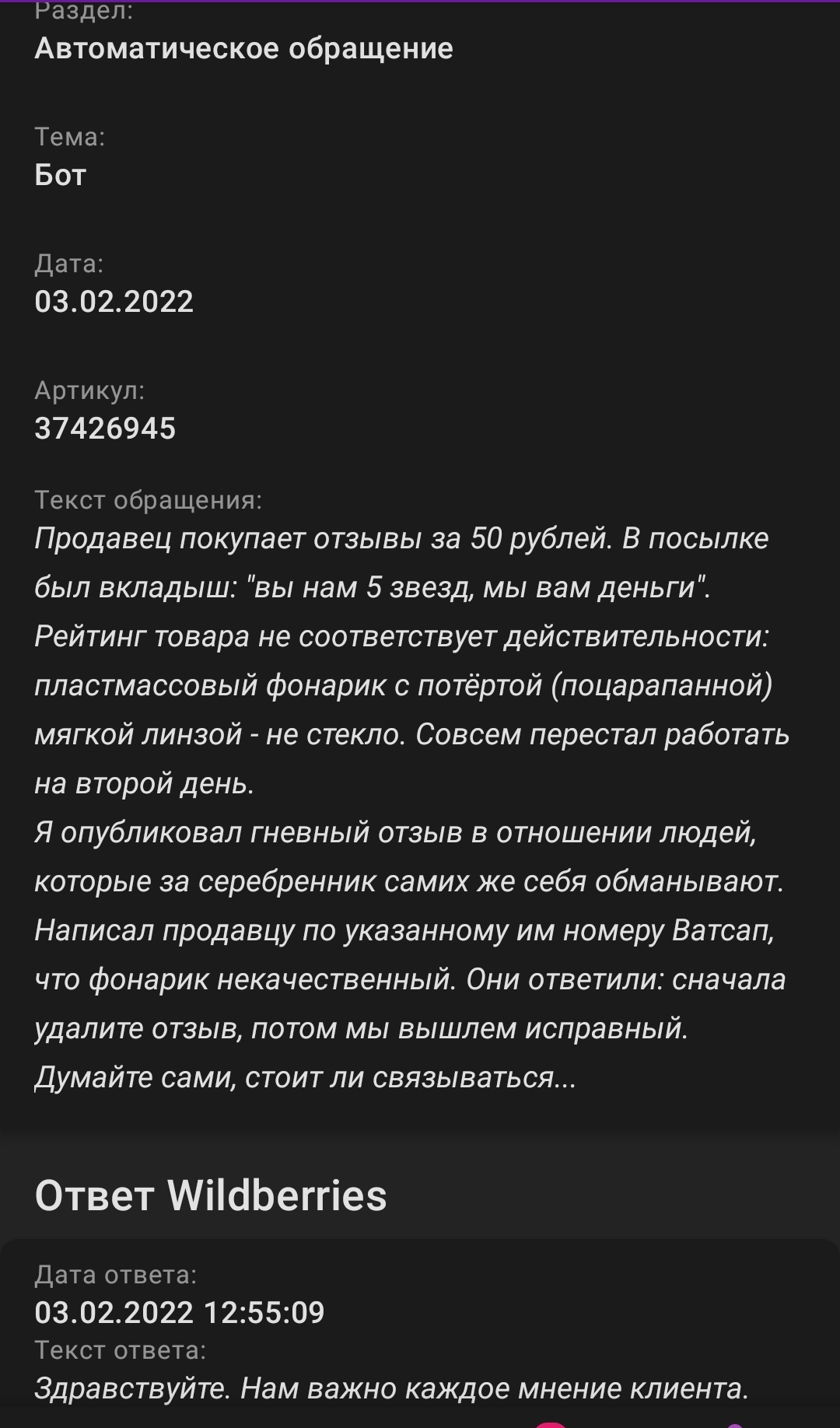 На претензию продавец ответил: "удали отзыв - пришлю новый фонарик".