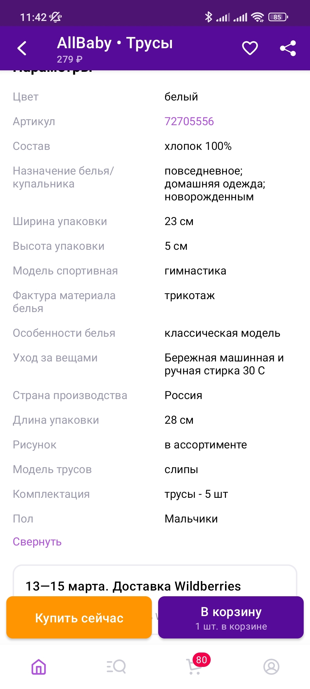 Но за две другие позиции просто меня бомбит. Заказ был набор трусиков детских из 5 штук (у этого продавца тоже 3 месяца назад покупала 2 набора, всё устроило, решила ещё взять). Прихожу получать - выносят 2 набора по 2 штуки. Почему? Сотрудник ПВЗ смотрит в карточку, а там указано в наборе 2 штуки. Оу, какая прелесть! Пока товар ехал, продавец изменил информацию в карточке и добавил новую фотку. Т.е. карточку изменили уже после заказа и оплаты, к слову сказать, что у заказа 3х месячной давности тоже изменилась информация о комплектации в карточке. С таким беспределом сталкиваюсь впервые! На гневный отзыв, который удалили из рейтинга, продавец мне отписался, что нужно информацию было изучать ДО ЗАКАЗА 🤬🤬🤬. Т.е. я олениха слепошарая, по мнению продавца. Кстати, привет тебе продавец AllBaby. Информация о товаре изменилась, а подчистить характеристики ещё не успели, заскринила для доказательства