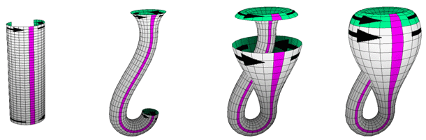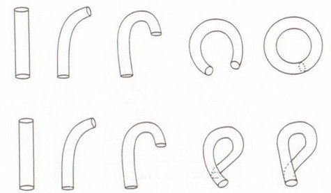 Допустим у нас есть бутылка с очень длинным горлом, в стенке и в донышке бутылки есть небольшие отверстия, соответствующие размеру горлышка. Берем бутылку за горло, изгибаем его, пропускаем вплотную через боковое отверстие, дотягиваемся горлышком до отверстия в дне бутылки и совмещаем их. Вот и получилось!