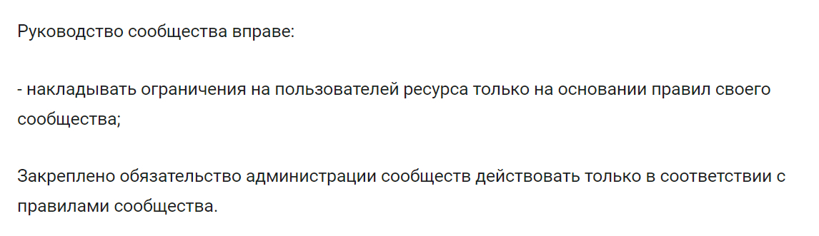 Закреплено обязательство администрации сообществ действовать только в соответствии с правилами сообщества.