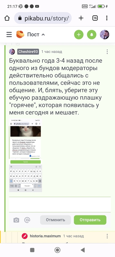 Поэтому модерация предъявляла более высокие требования к контенту такого типа, вызывая недоумение и вопросы со стороны пользователей, готовых поверить данным типам информации. Изменение правил направлено на то, чтобы снять такие вопросы. Я понимаю, что Особый порядок в политике и остросоциальных постах не дает пикабушникам выражать всё то, что они думают и вступать в ослепительно яркие дискуссии, однако с другой стороны, видя тот контент, который в массе своей удаляют модераторы, я радуюсь тому, что больше никто не видит той грязи и тех ужасов, которые публикуются у нас каждый день на протяжении вот уже полутора лет. Поэтому, я думаю, вряд ли найдутся люди, которые больше наших модераторов ждут, когда можно будет прекратить действие Особого порядка.