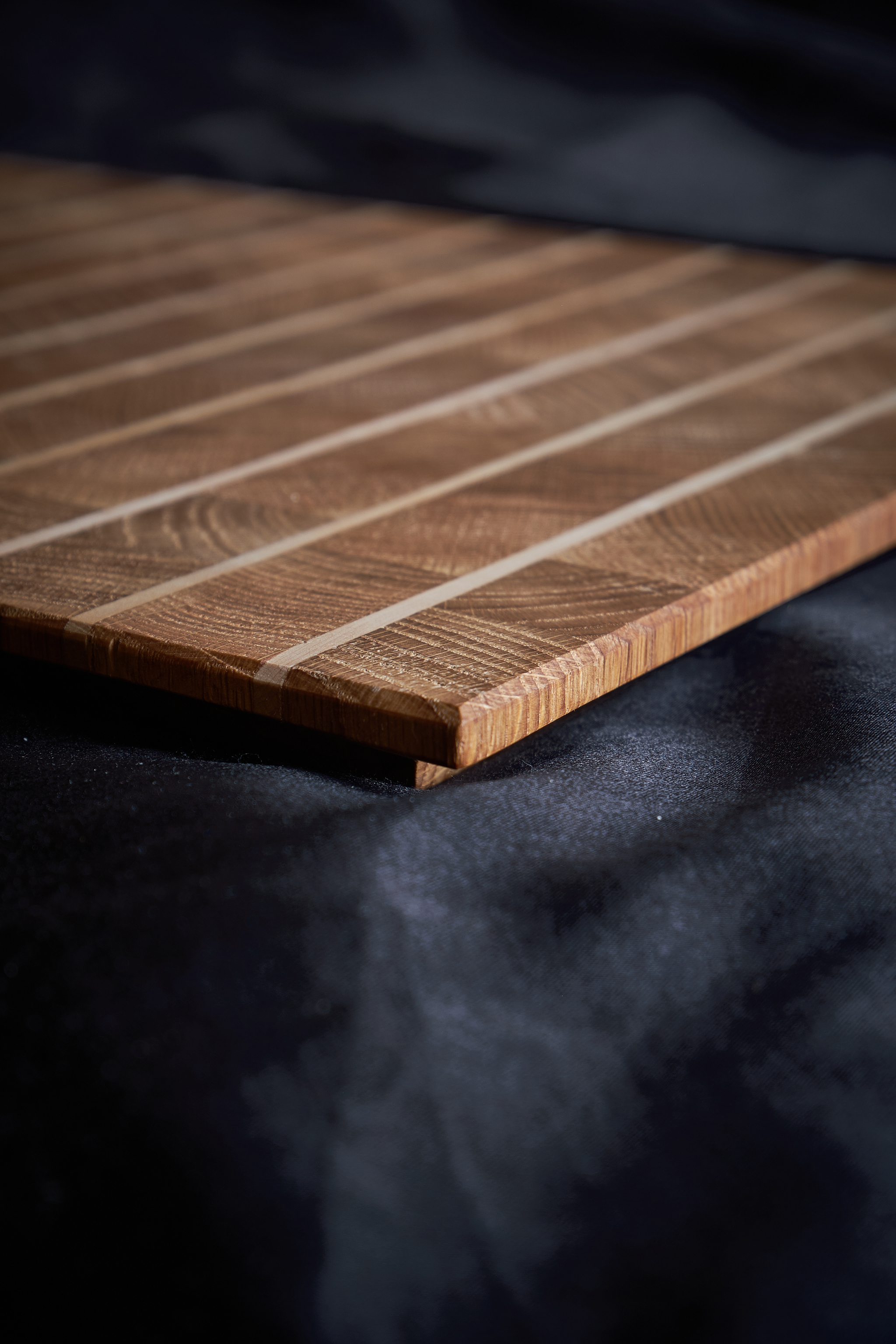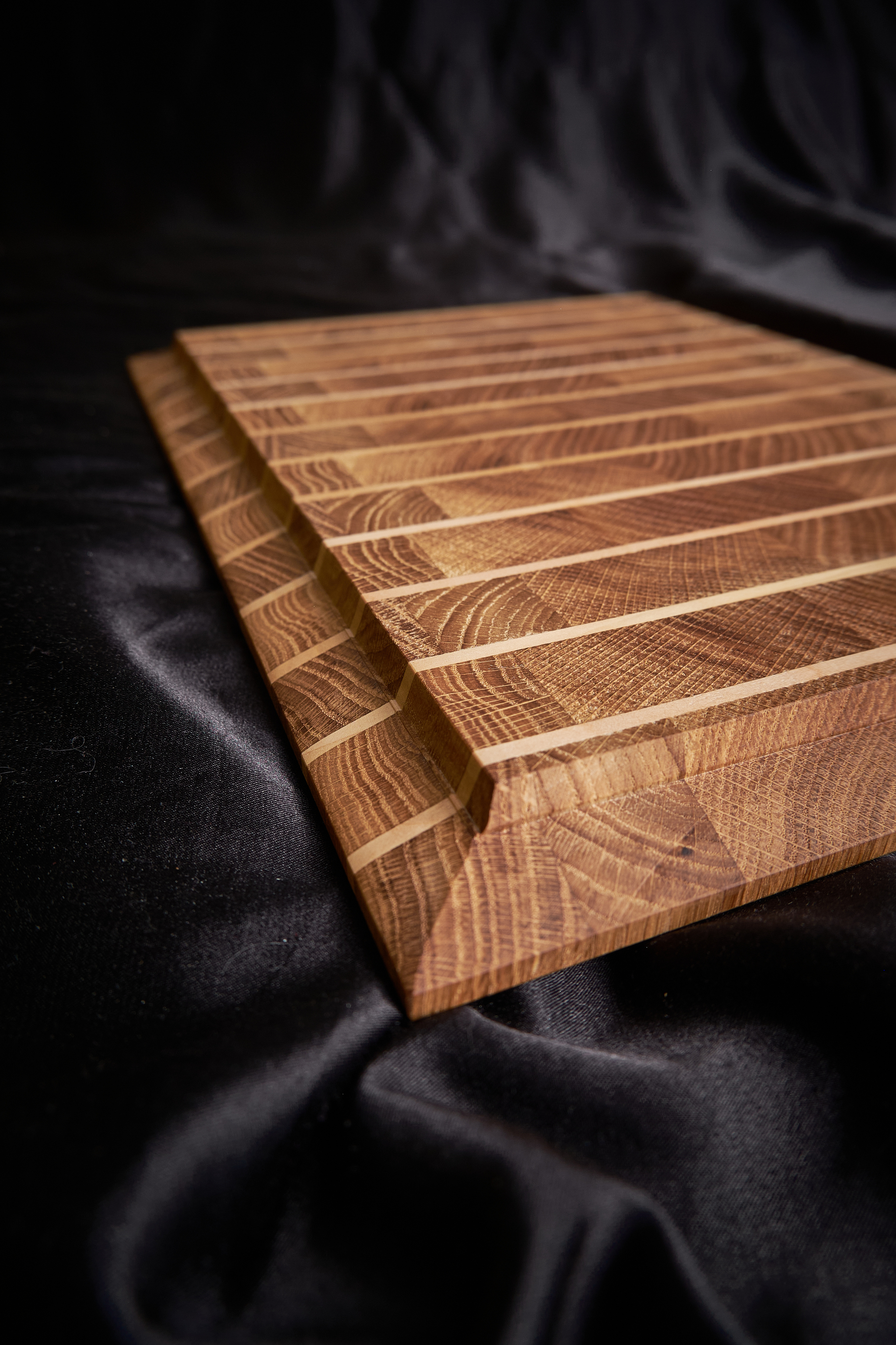 Вторая доска - декоративная, для подачи. Тоже дуб и грушевые полоски. Отдельной фишечкой является нижняя фаска, снятая под острым углом, и когда доска стоит на столе, то у нее почти не видно нижнего края, создается ощущение некой "левитации и легкости" доски